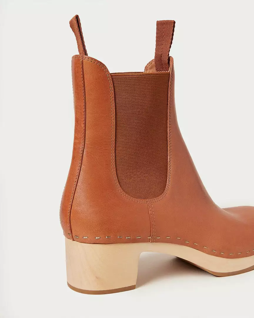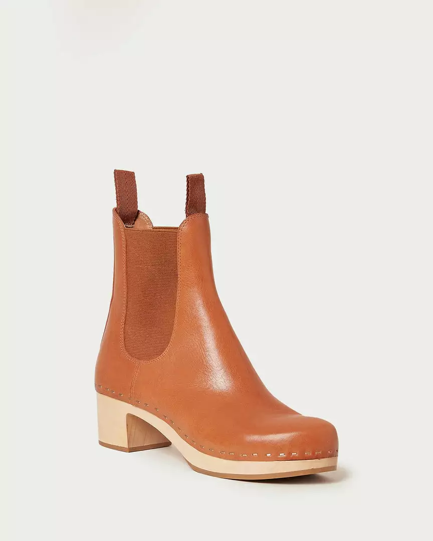 Ankle boot with a wooden clog heel, elastic gusset, and stapled detailing in cognac brown vegetable-tanned Italian vachetta leather. Padded footbed with gold stamped logo. Almond toe, rubber outsole, pulls on with pull tabs. 2.25 inch heel.
