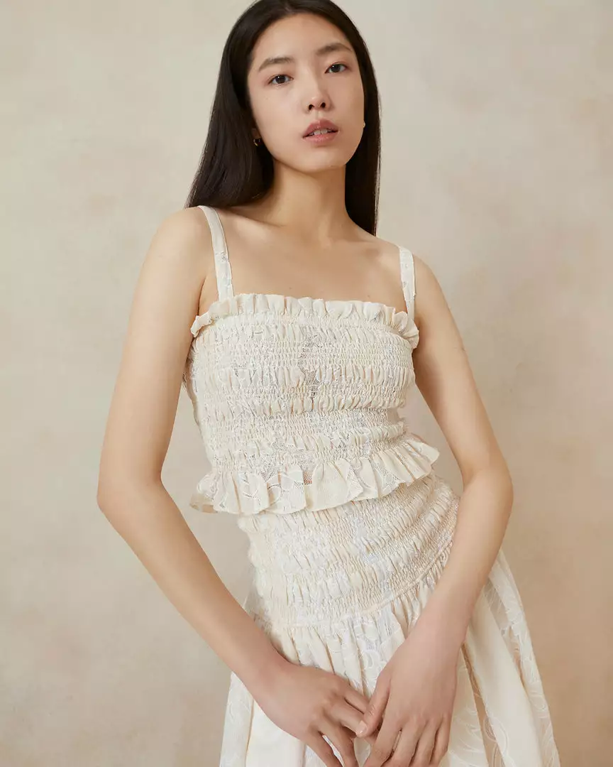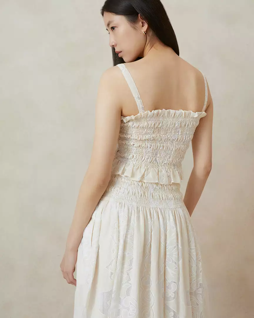 Smocked camisole top in ecru lace broderie. Features ruffles along the neckline and hem, a square neckline, and a sleeveless, cropped construction.