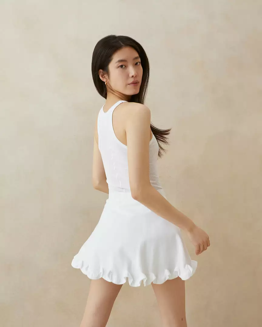 Tennis skirt in white cotton featuring a ruffled hem and elasticized waistband.