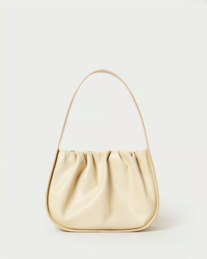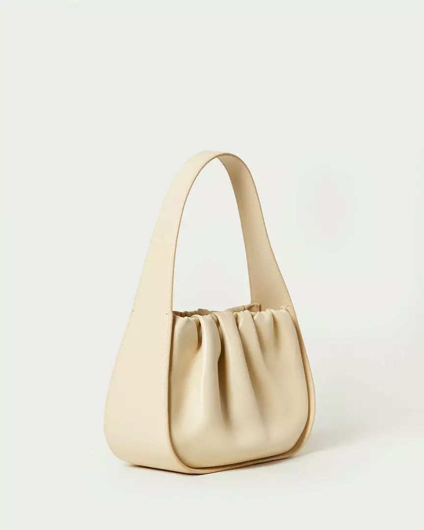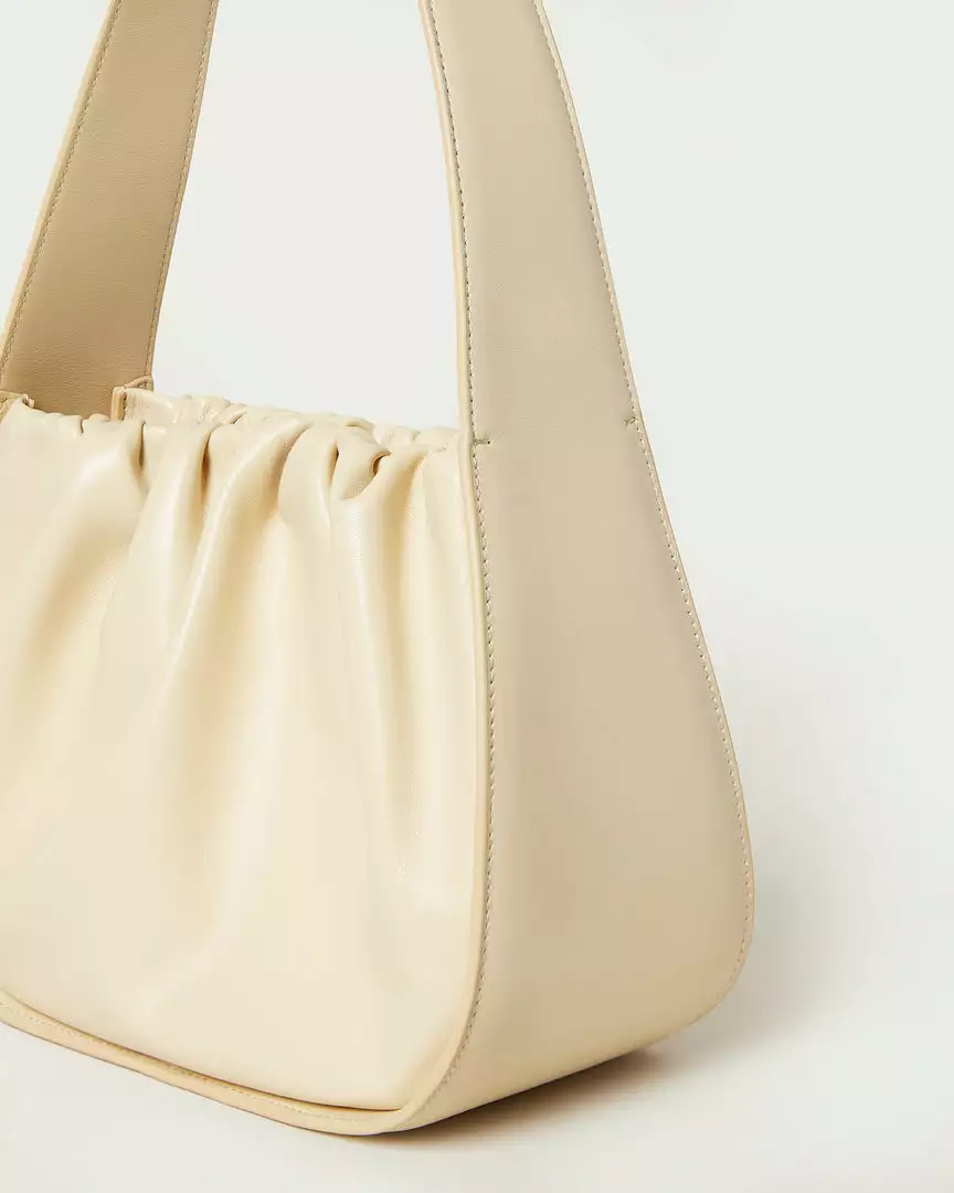 Gathered shoulder bag in almond cream-colored leather. Features a shoulder strap, magnetic closure, cotton lining, and a small interior slip pocket.