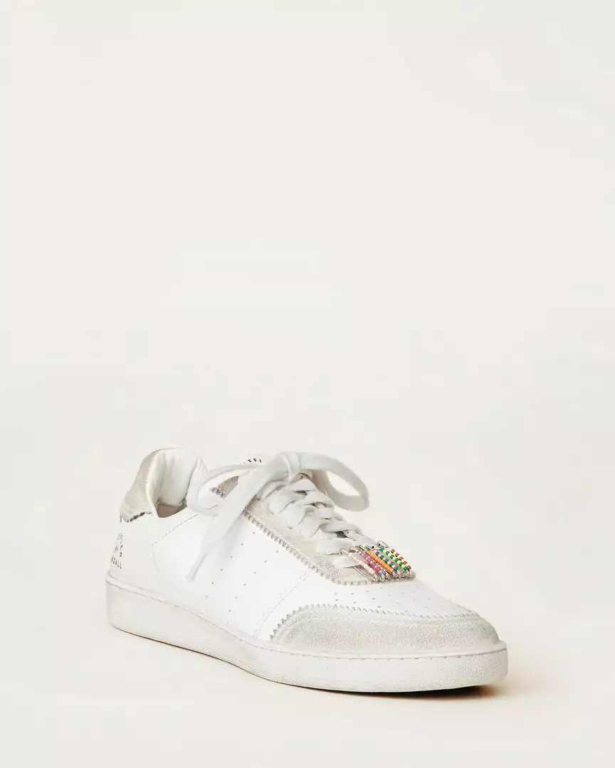 Low top sneaker in white leather with cement gray suede trim and removable beaded pins. Padded footbed with LR sport logo. Round toe with white laces.