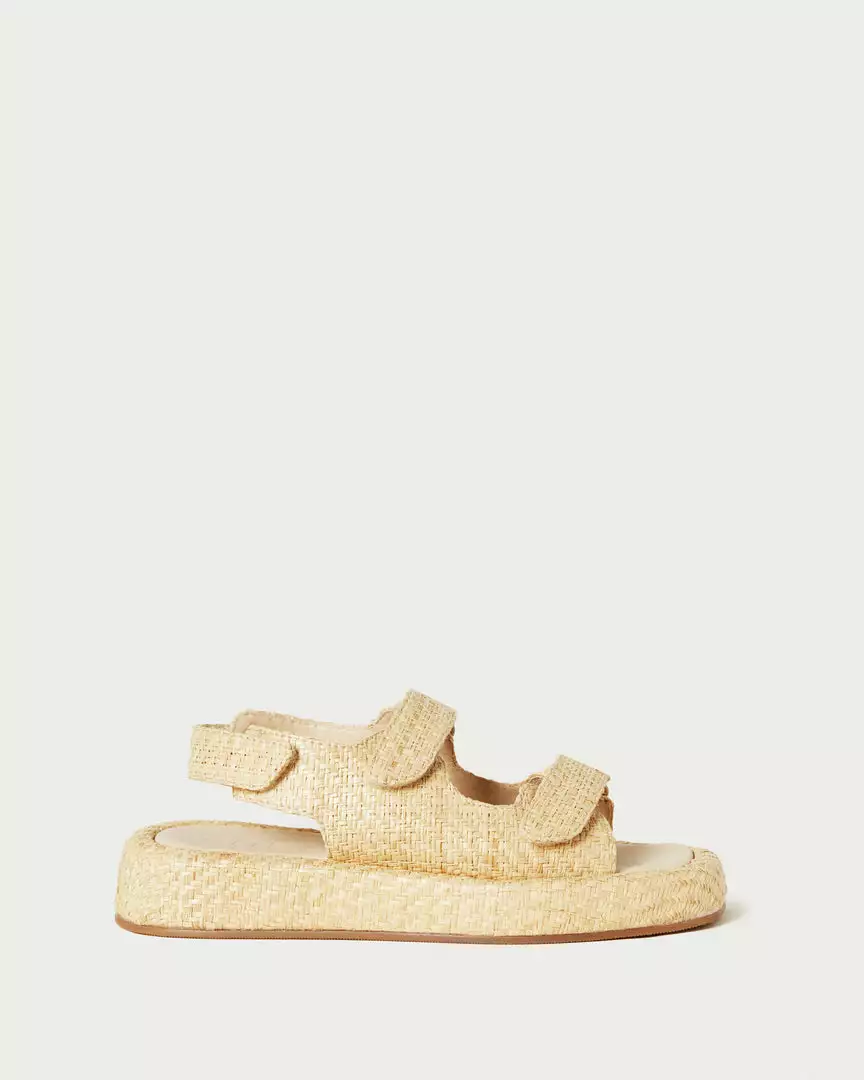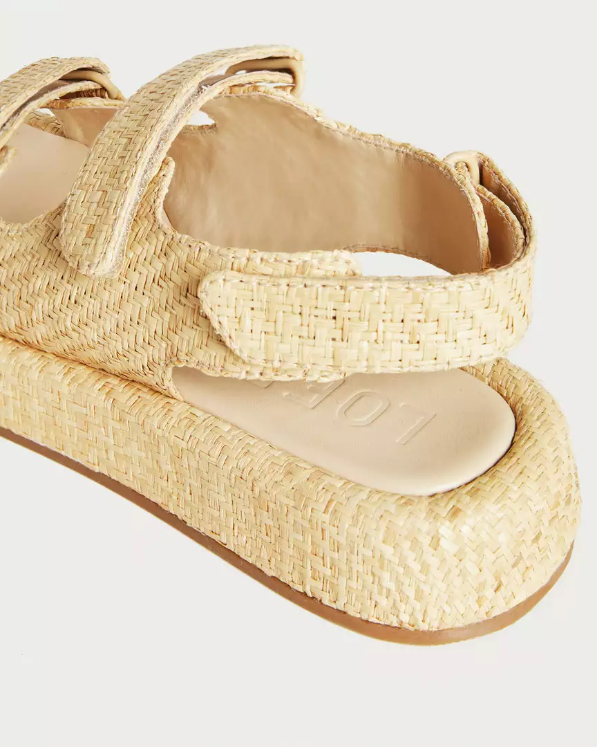 Two band sport sandal with adjustable velcro straps in natural raffia. This style features a slightly squared toe and and extended flatform sole for a chunky look. Open toe, adjustable heel strap, 1.25 inch platform sole.