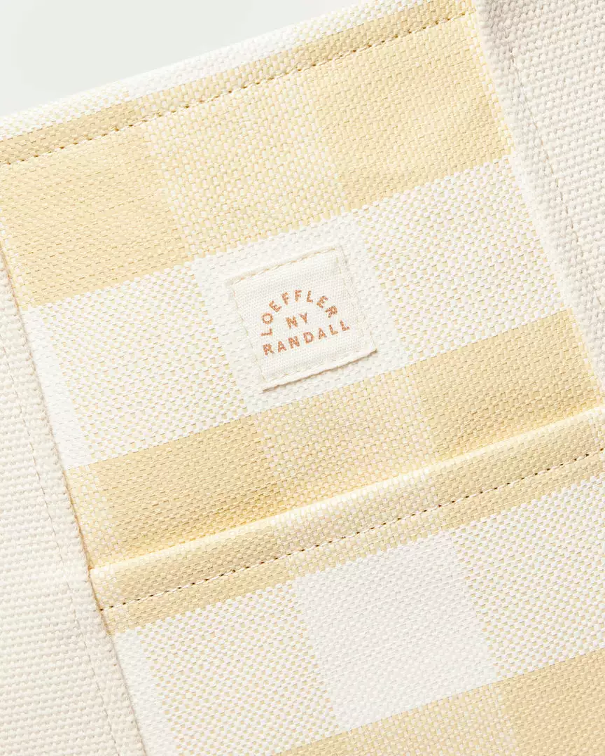 Oversized open tote bag in hay pale yellow and cream-colored gingham woven plastic. Features natural-colored cotton woven handles and an inside pocket.