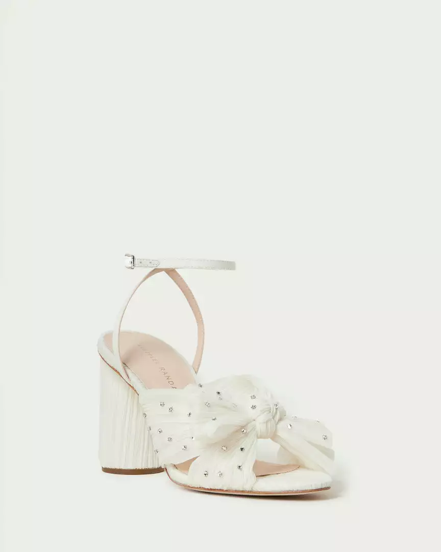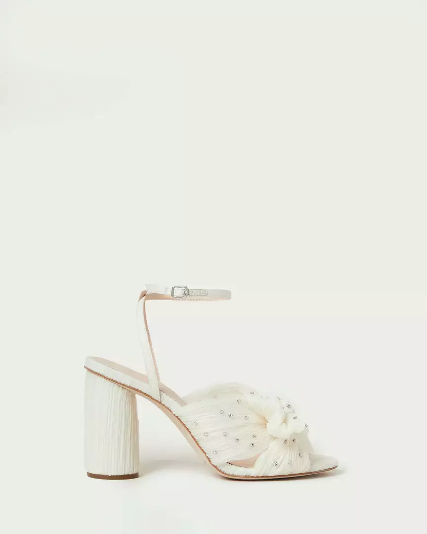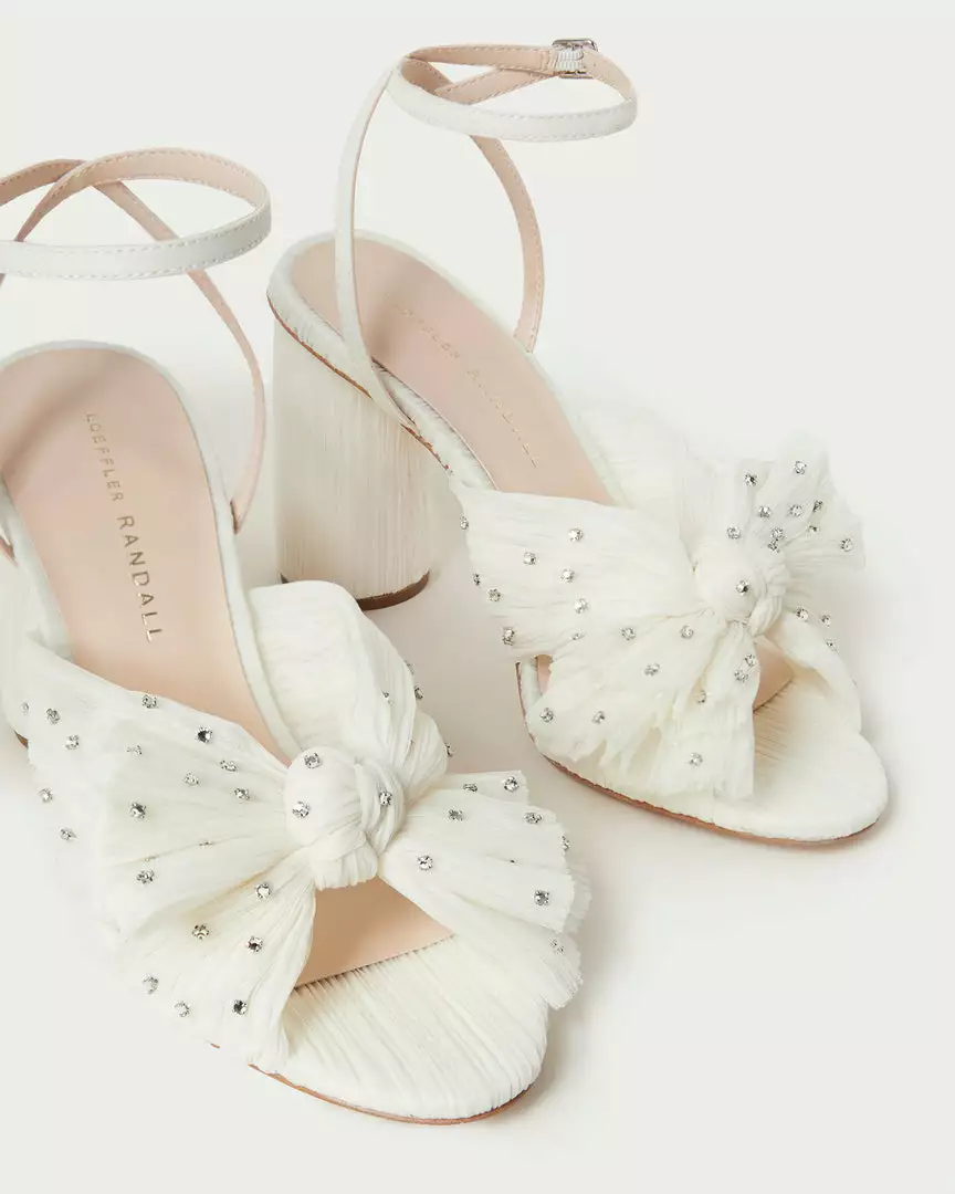 Pleated heeled sandal in ivory pearl fabric topped with our signature knotted bow and embellished with rhinestones. Features a padded footbed with gold stamped logo. Open toe with adjustable buckle ankle strap. 3.5 inch heel. Made completely from vegan-friendly materials.