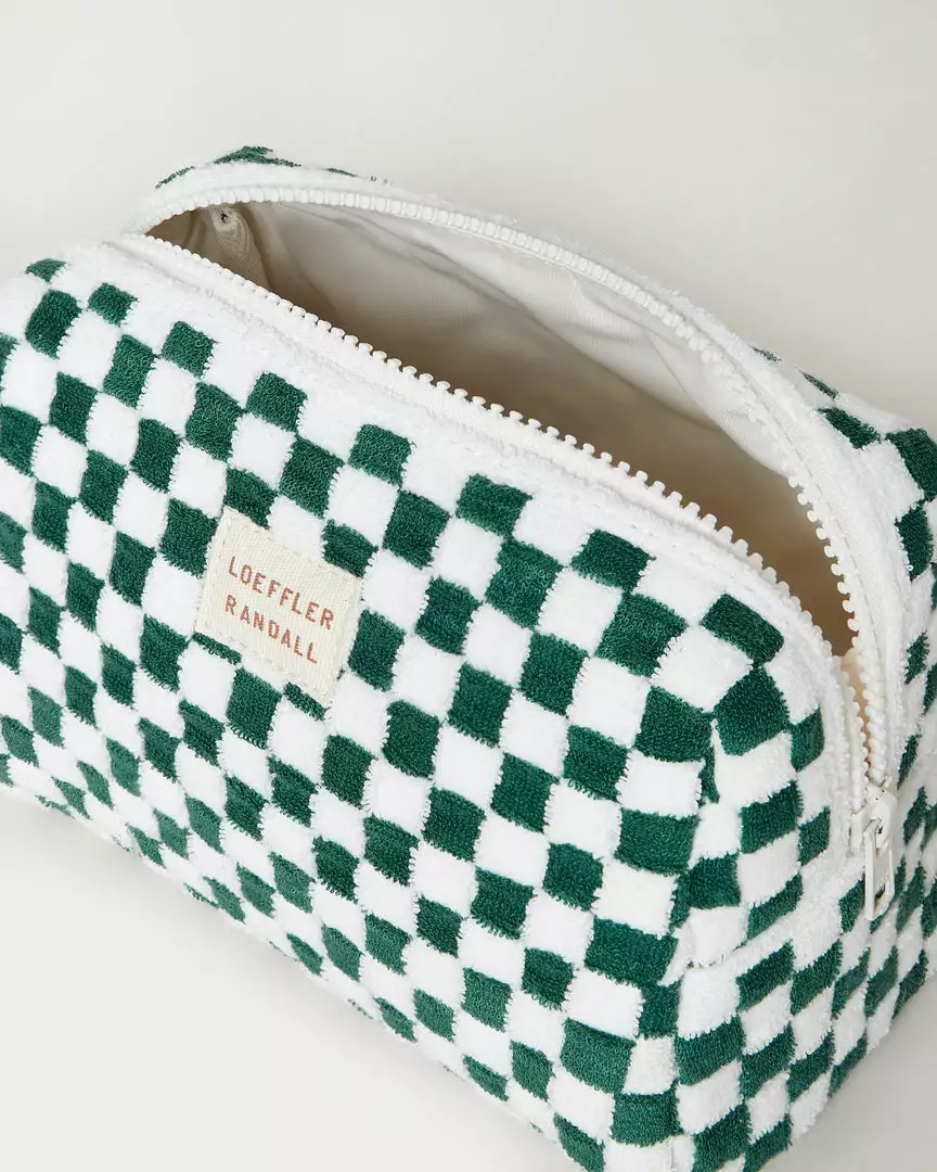 Cosmetic pouch in kelly green and cream gingham print terrycloth. Features the LR sport logo and a zipper closure.