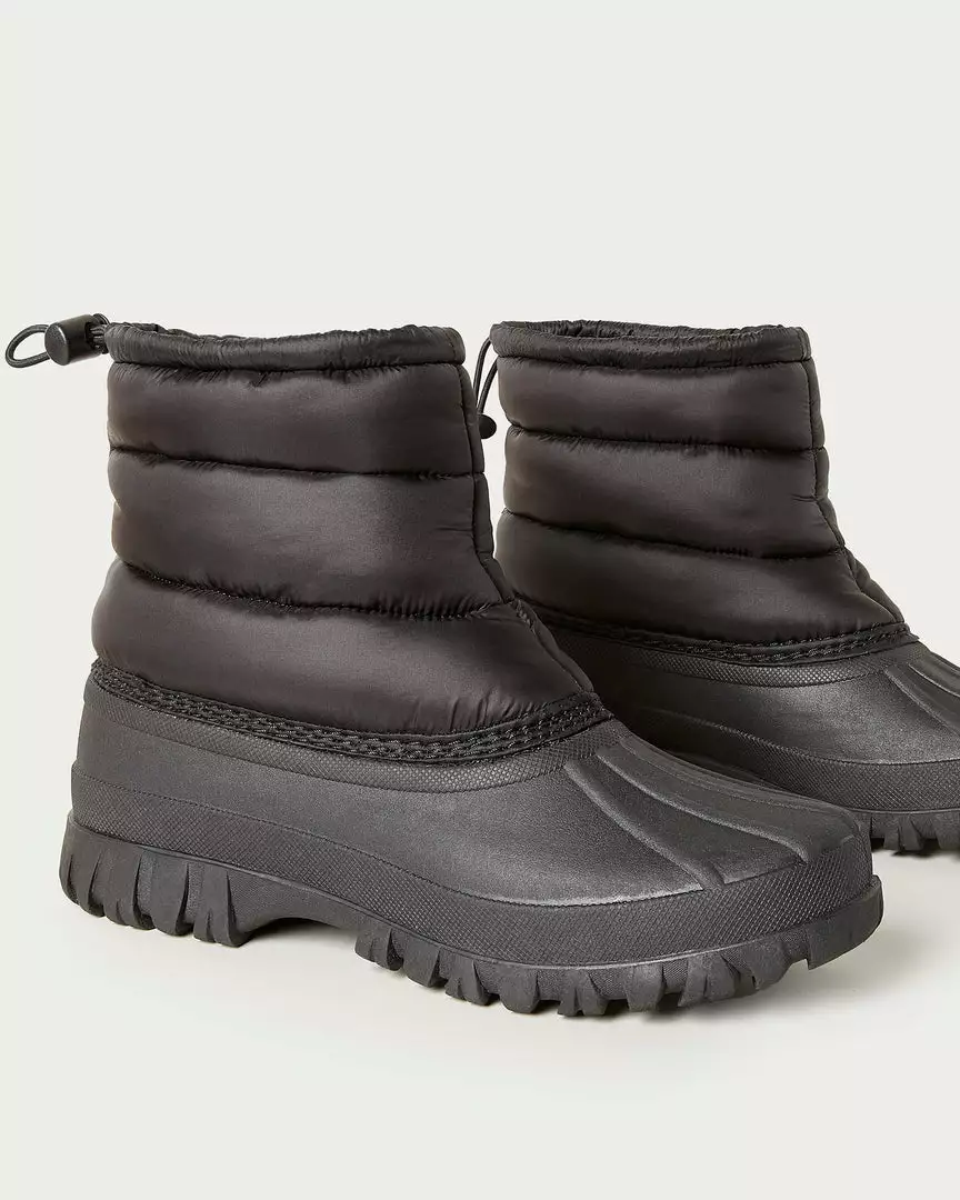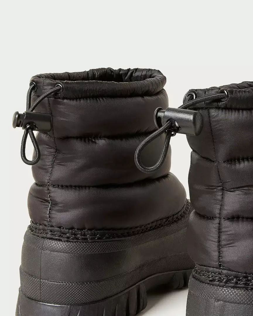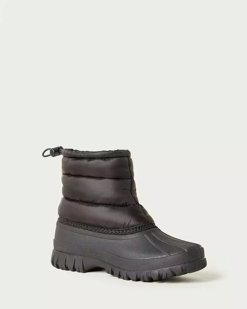 Puffer duck boot in black water-resistant nylon. Features a padded footbed, faux shearling lining, round toe, and an adjustable elastic pull cord closure. 0.75 inch heel.