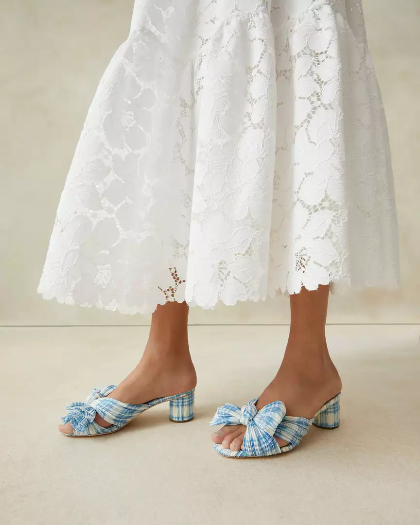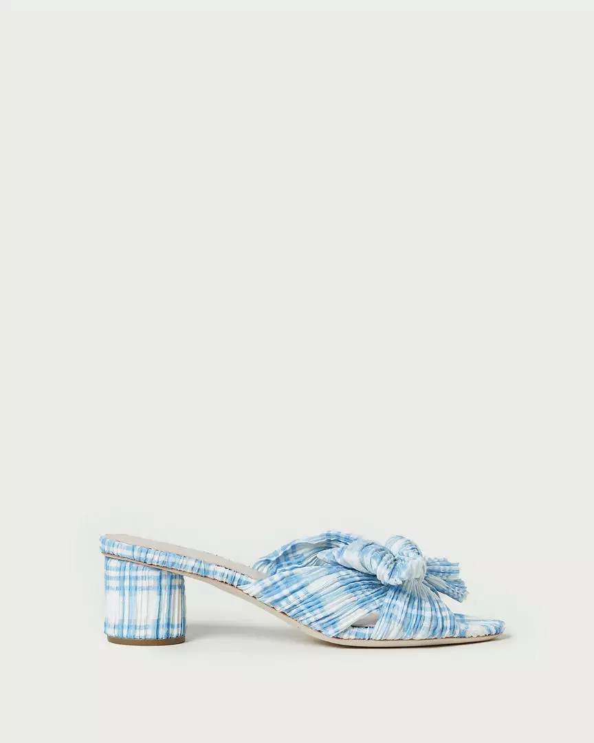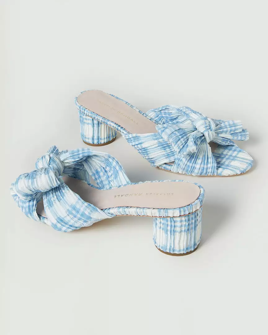 Pleated mid-heeled sandal in blue and cream plaid-printed fabric topped with our signature knotted bow. Features a padded footbed with gold stamped logo. Open toe, slips on. 2 inch heel.