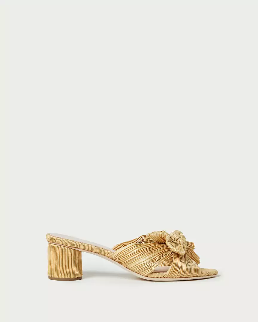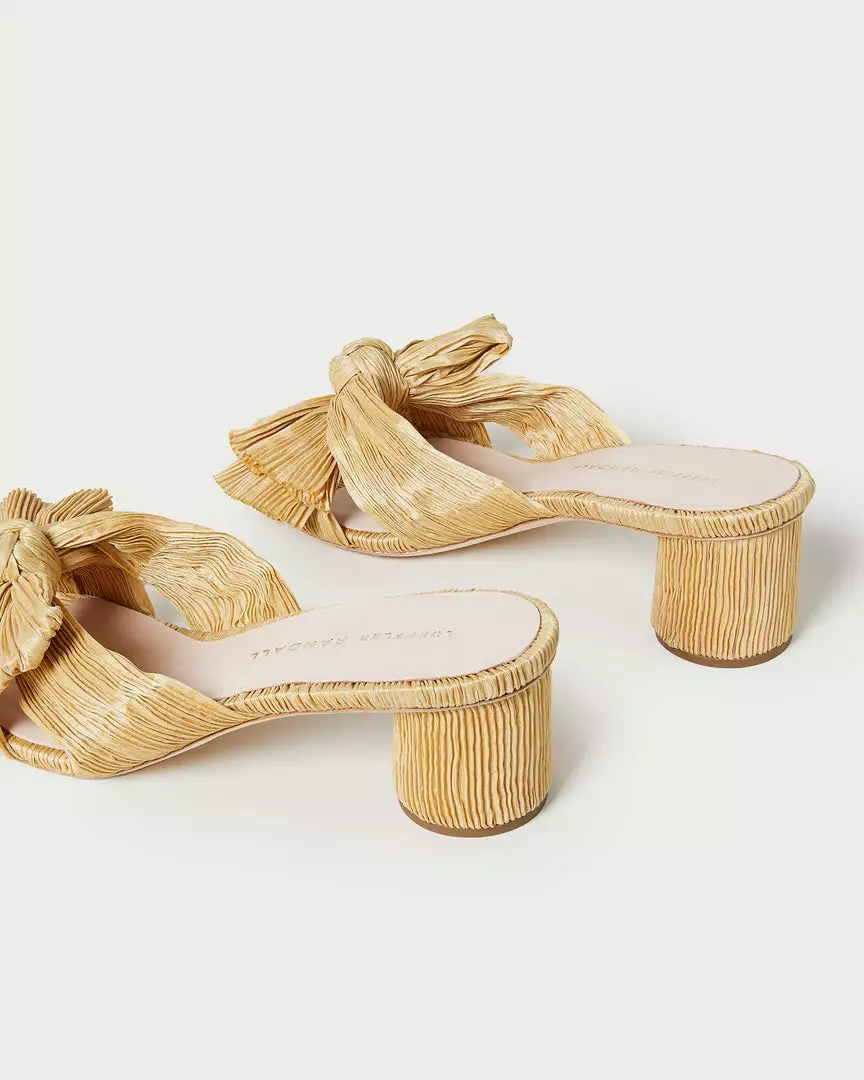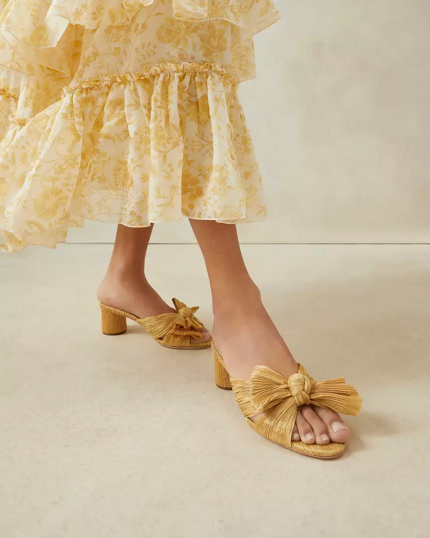 Pleated mid-heeled sandal in pale yellow fabric topped with our signature knotted bow. Features a padded footbed with gold stamped logo. Open toe, slips on. 2 inch heel.