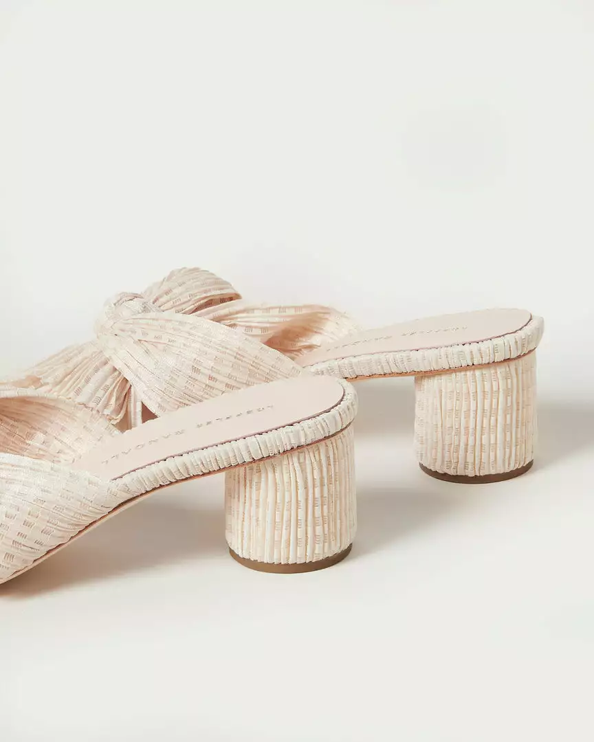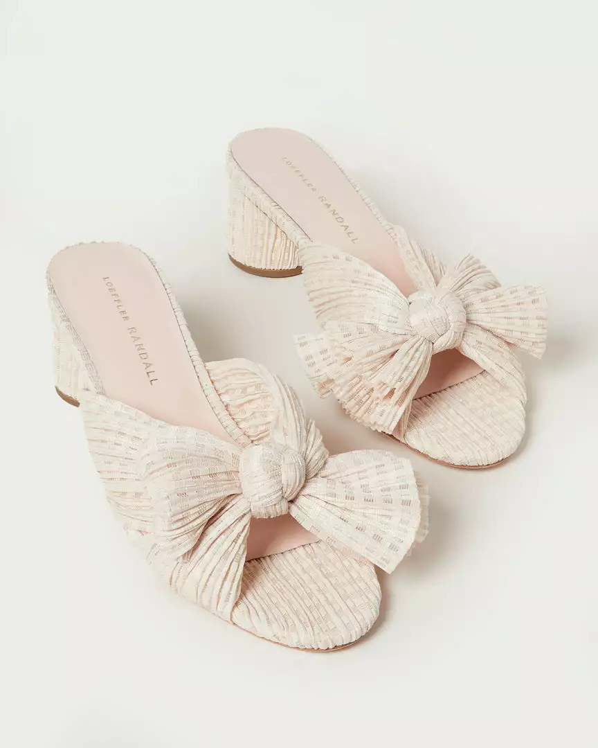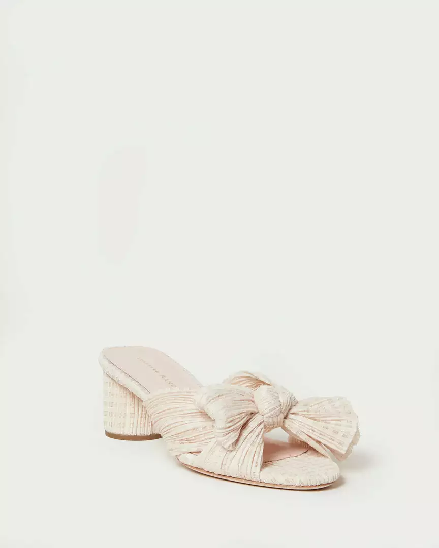 Pleated mid-heeled sandal in cream plaid fabric topped with our signature knotted bow. Features a padded footbed with gold stamped logo. Open toe, slips on. 2 inch heel.
