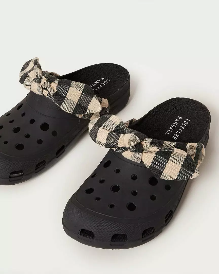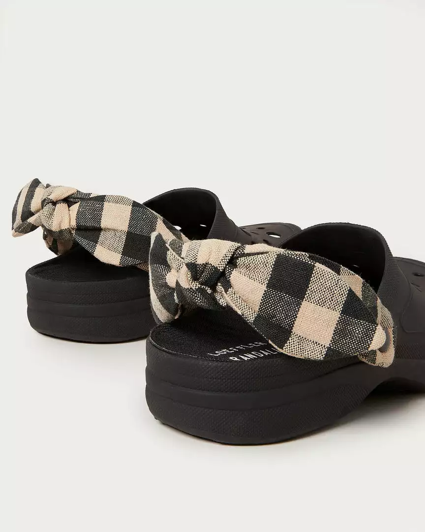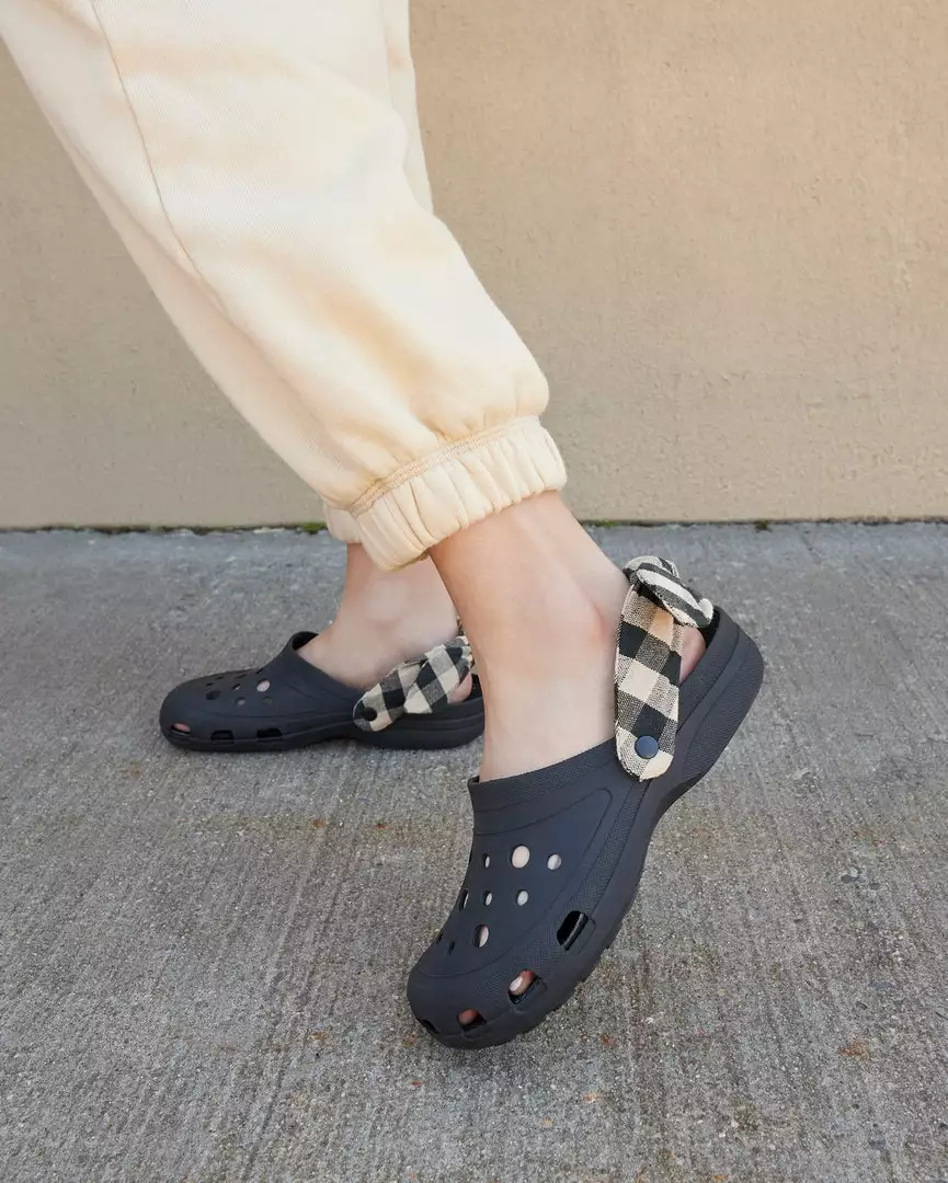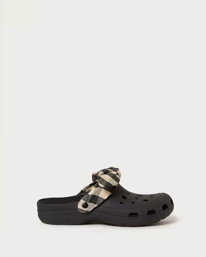 Rubber clog in black with a brown and tan gingham-printed fabric bow. The strap is adjustable and can be worn either behind the heel or in front of the ankle. Features vented holes for breathability. Water-resistant.