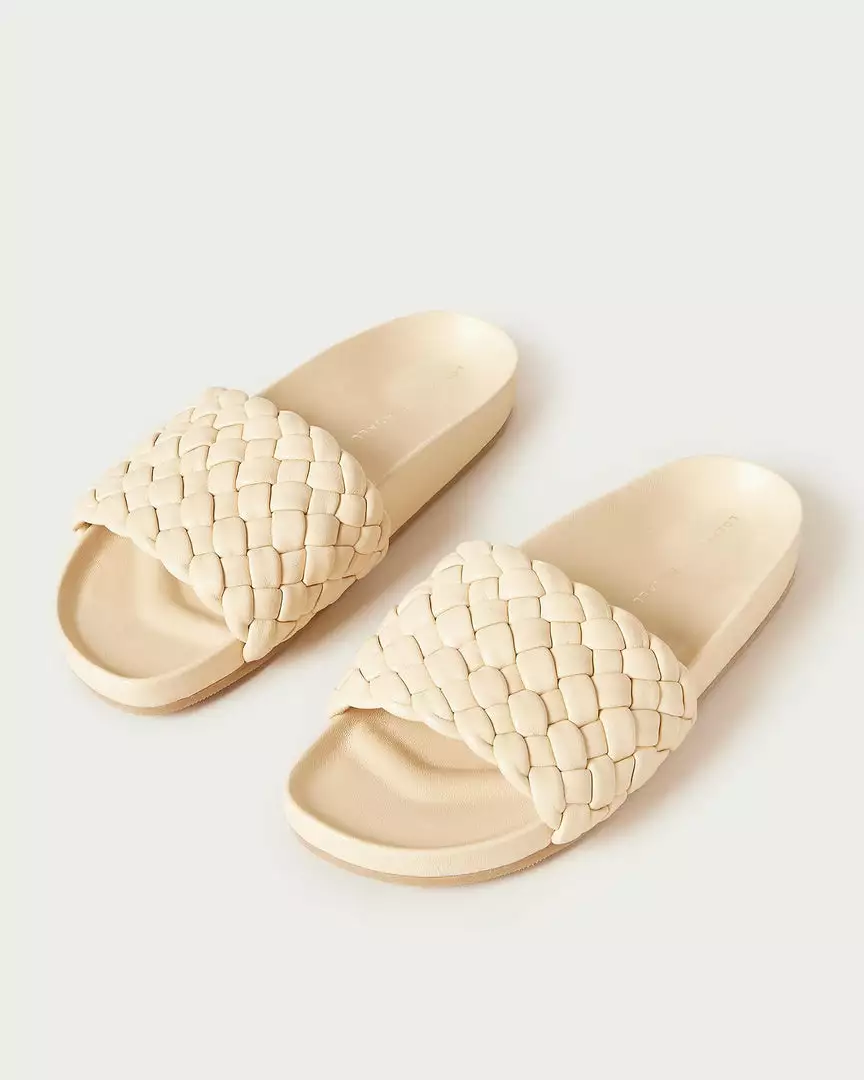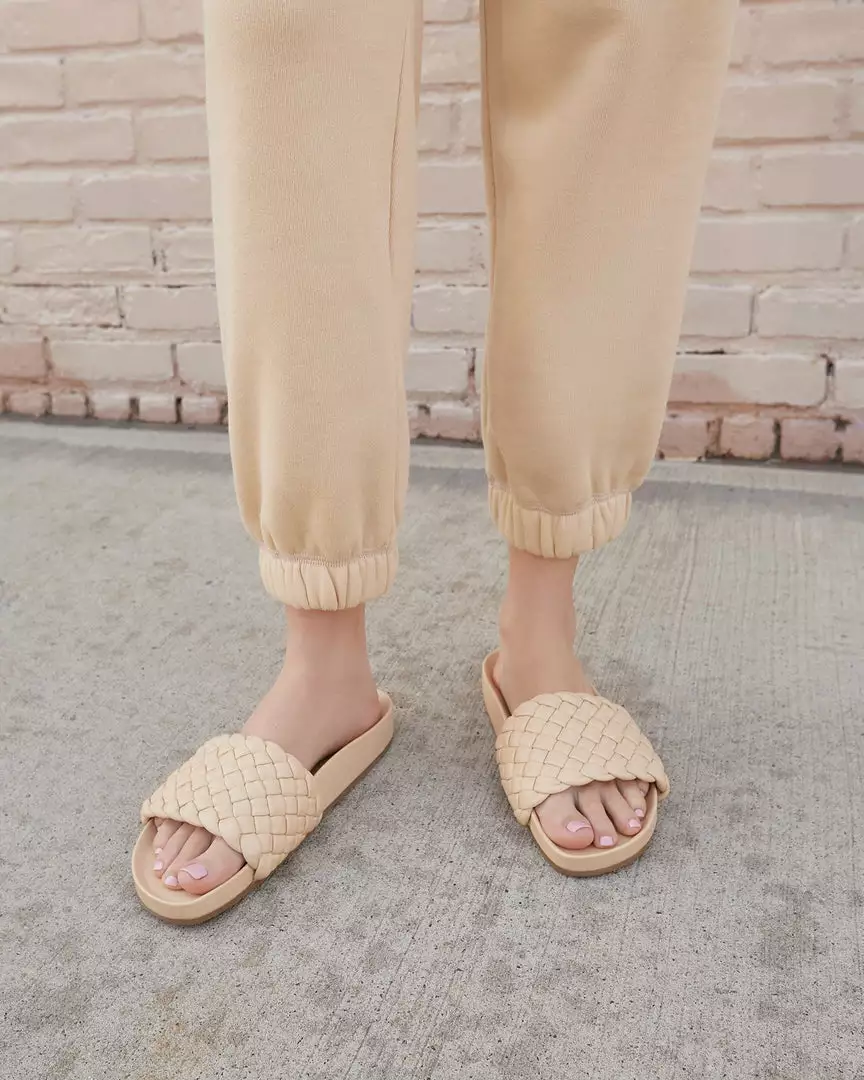 Puffy flat slide sandal with a woven buttery almond leather upper and a leather wrapped padded footbed.
