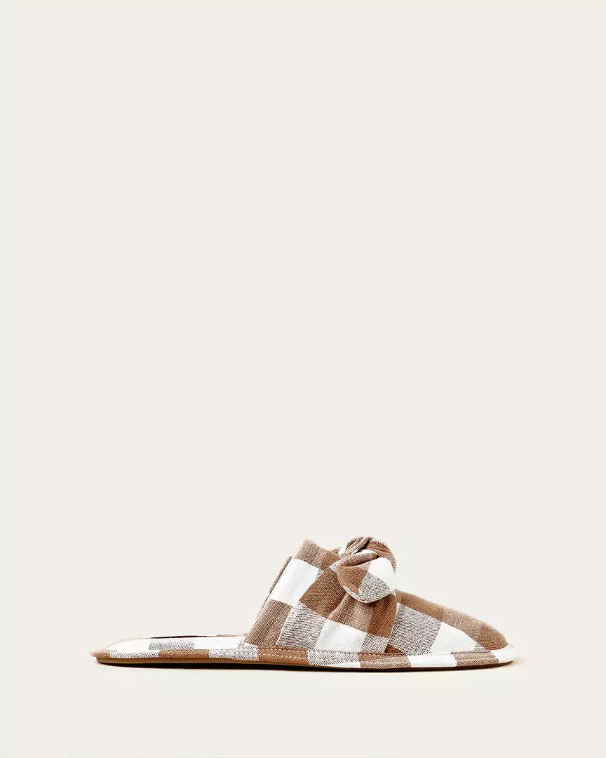 Cushion sole house slipper in cream and brown check gingham fabric with bow detail.