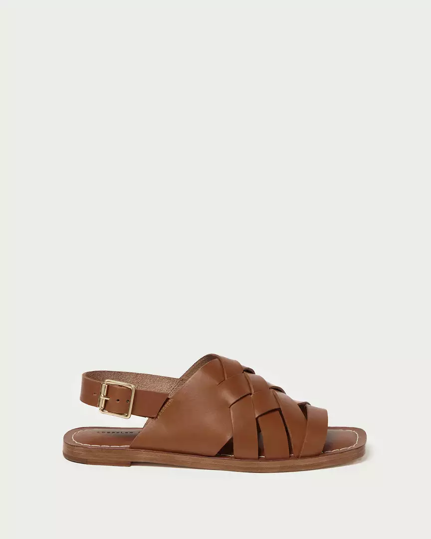 Flat plank sandal with a crisscross woven upper in cognac brown vachetta leather. Features an open toe and adjustable heel strap.
