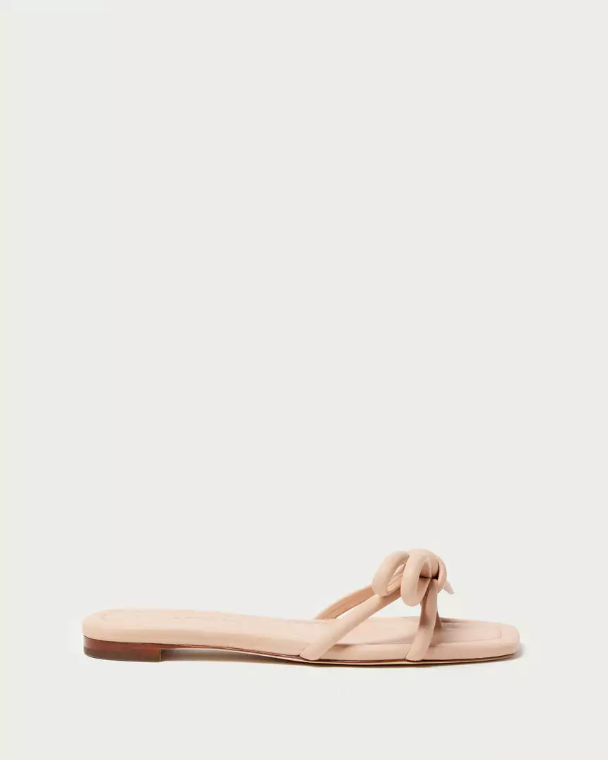 Flat slide sandal with knotted bow detail in ballet pink Italian glove calf leather. Features a padded footbed with gold stamped logo, tonal stitching, and an open, square toe. Slips on.