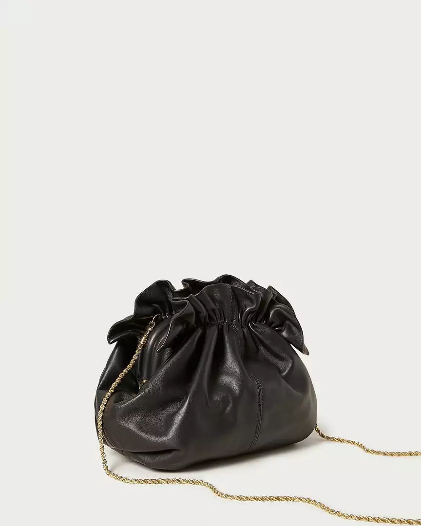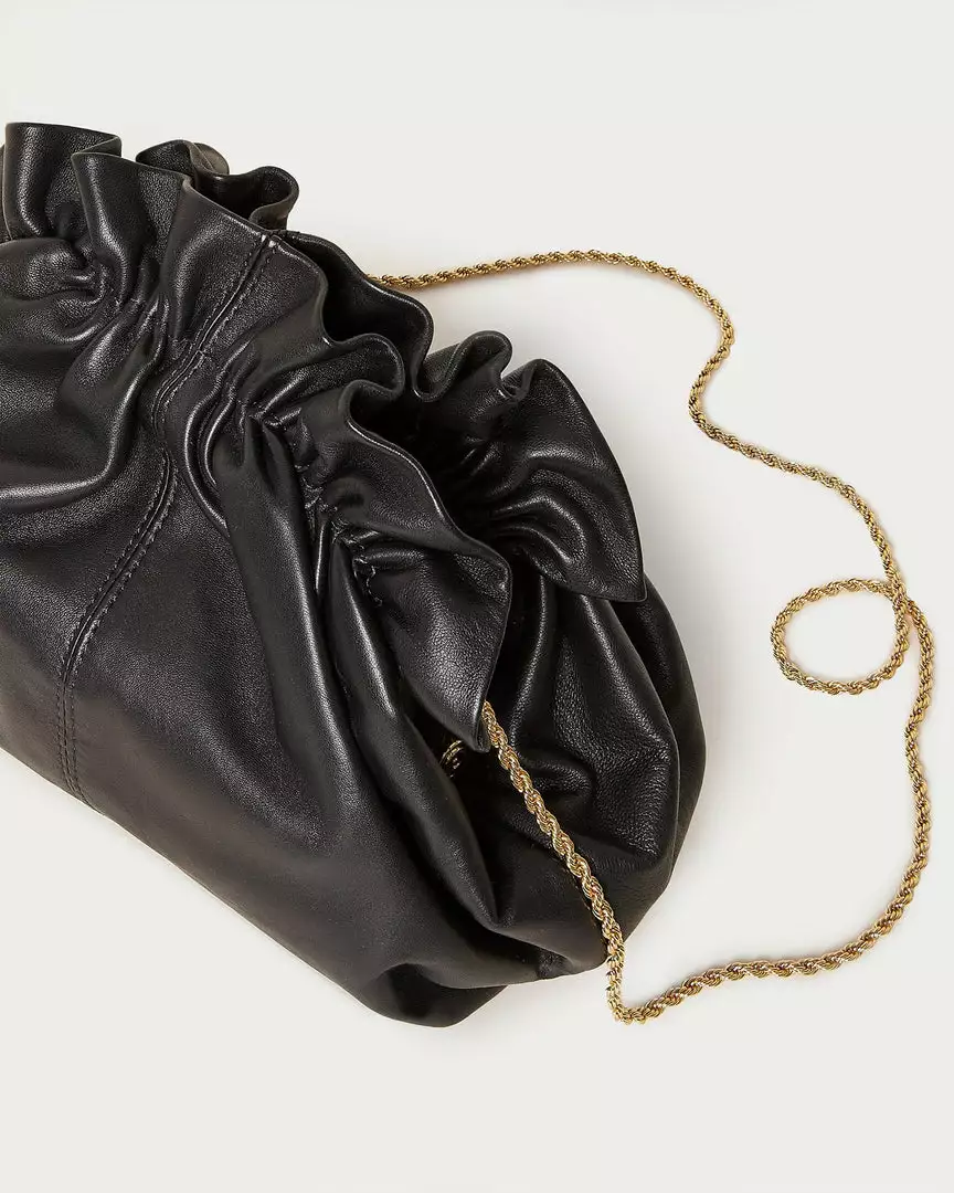 Gathered mini frame clutch in black nappa leather with detachable gold metal twisted chain crossbody strap.