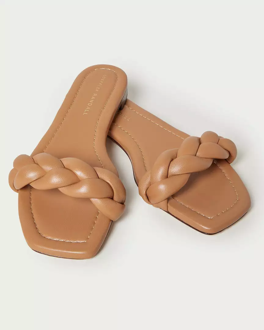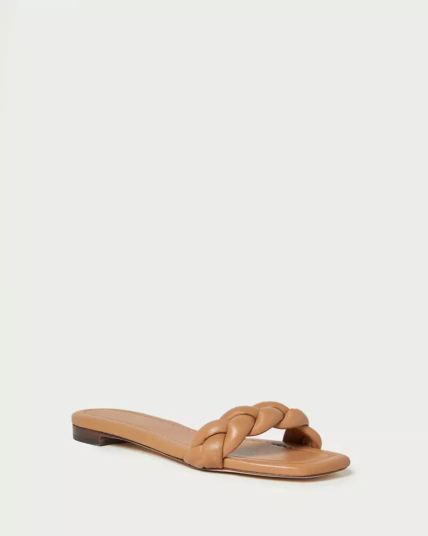Flat sandal in dark sand tan nappa leather with braided band detailing. Features a padded footbed and an open, squared toe. Slips on.