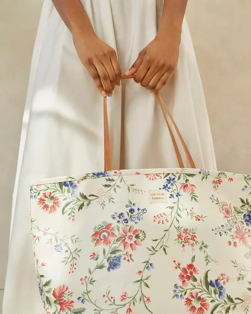 East-West tote bag in cream vine floral-printed coated canvas. Features leather top handle straps and an interior pocket.