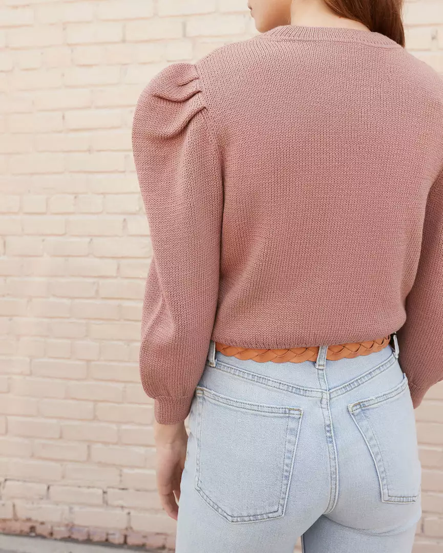 Puff-sleeved short pullover crew neck sweater in blush pink wool. A lightweight knit that can be worn year-round. This sweater is 100% Andean Highland wool made in Peru by a collective of knitters whose work provides support to women and children living in poverty on an island called Amantani on Lake Titicaca.