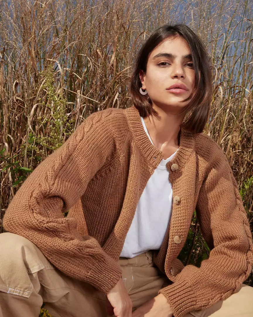 Cropped crewneck caridgan with cable knit detailing on sleeves and tortoiseshell buttons in nutmeg colored brown wool. This sweater is 100% Andean Highland wool made in Peru by a collective of knitters whose work provides support to women and children living in poverty on an island called Amantani on Lake Titicaca.