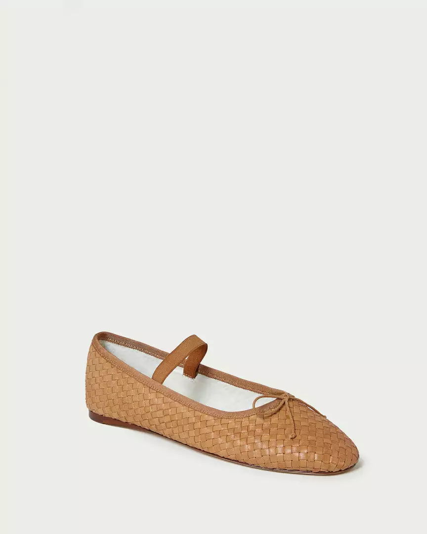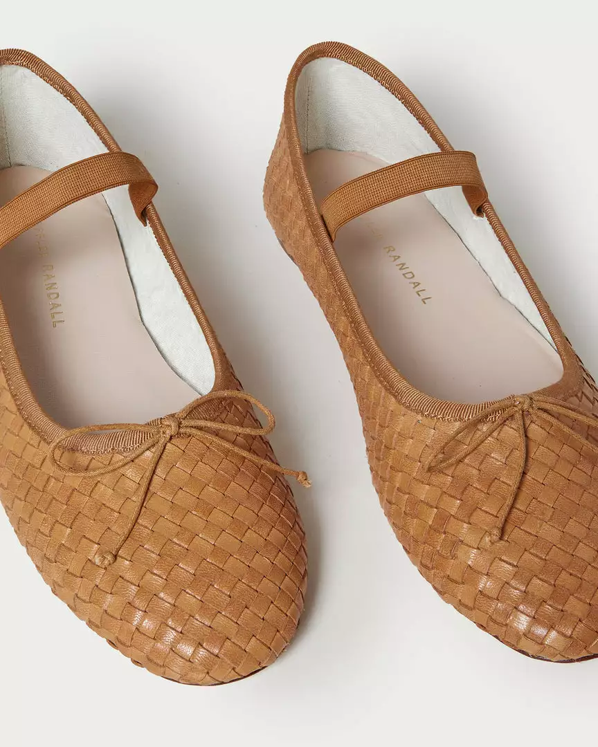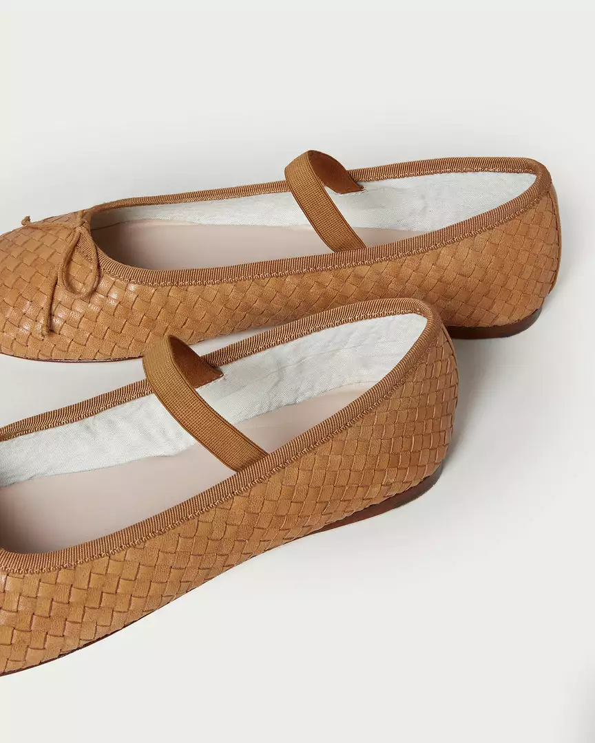 Soft ballet flat in honey tan woven leather with an elastic bridge strap and bow detail. Features a padded footbed with gold stamped logo and an almond toe.