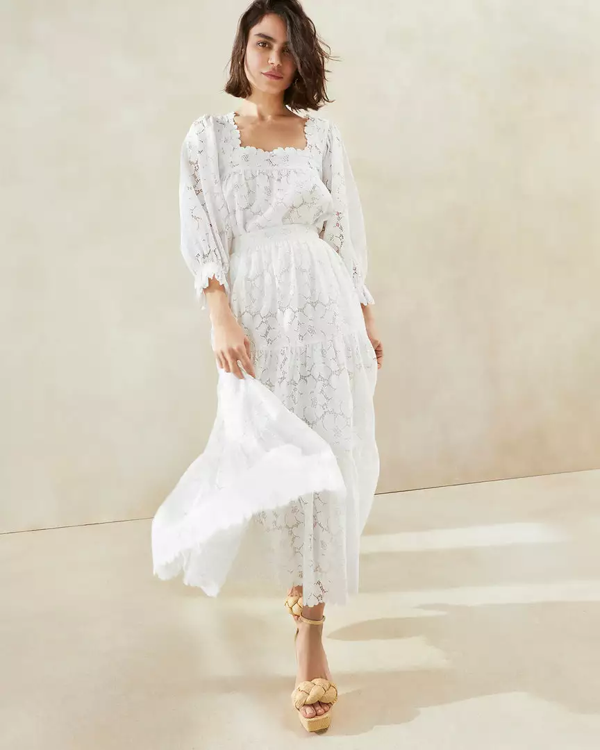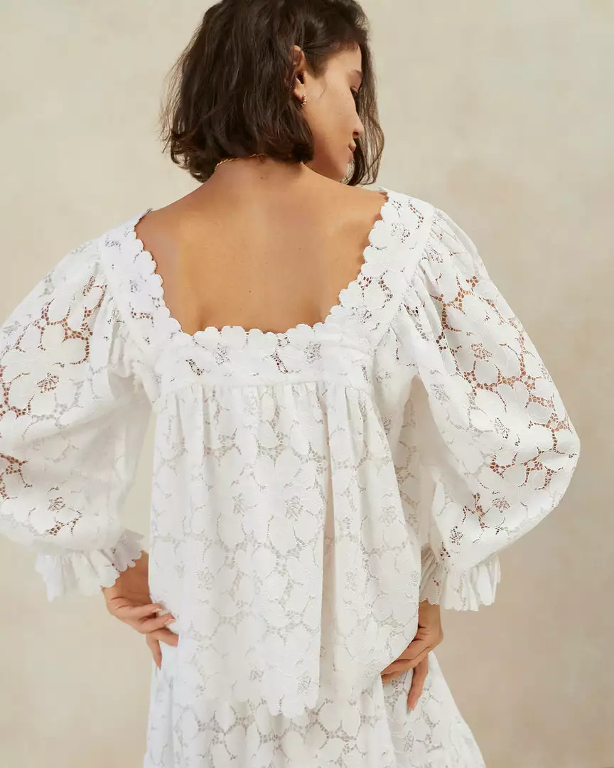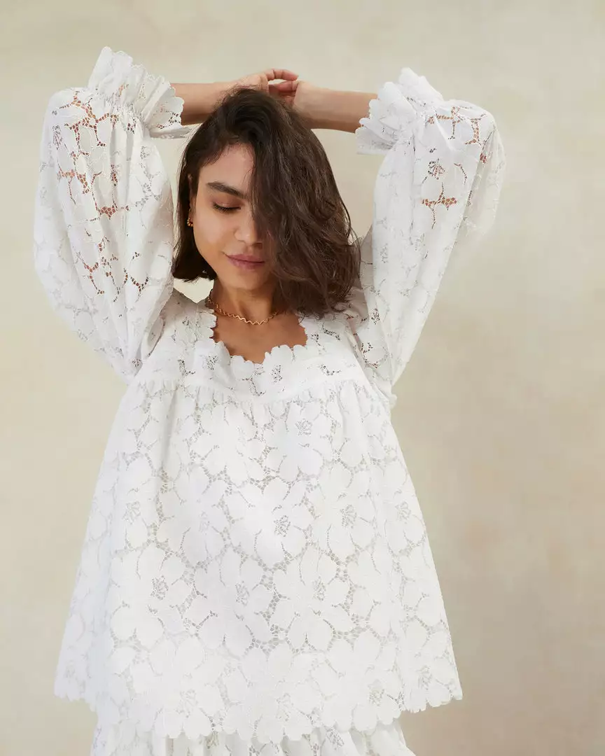 Square neck top in cream-colored lace. Features ruffled trim at the ends of the sleeves and scalloped detailing along the neckline.