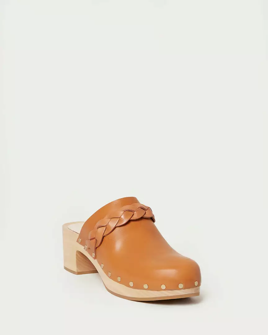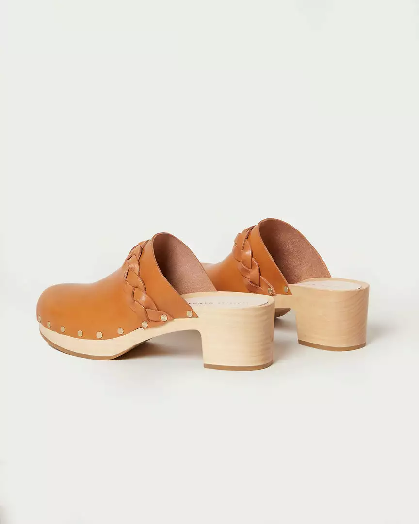 Wooden mid-heeled clog with studded detailing and braided decorative strap in cognac brown Italian vachetta leather. Features a padded footbed with gold stamped logo. Round toe, slips on. 2 inch heel, 1 inch platform.