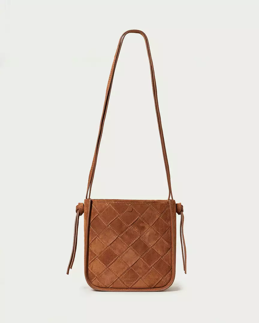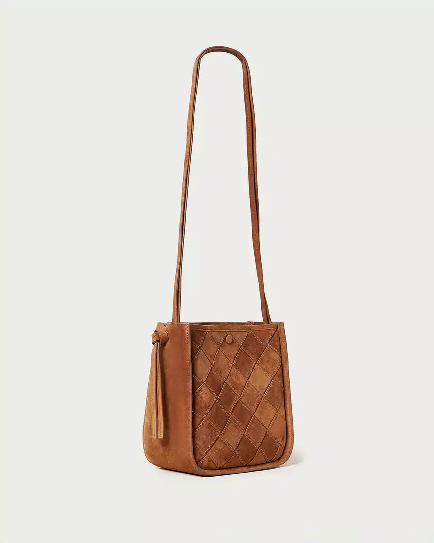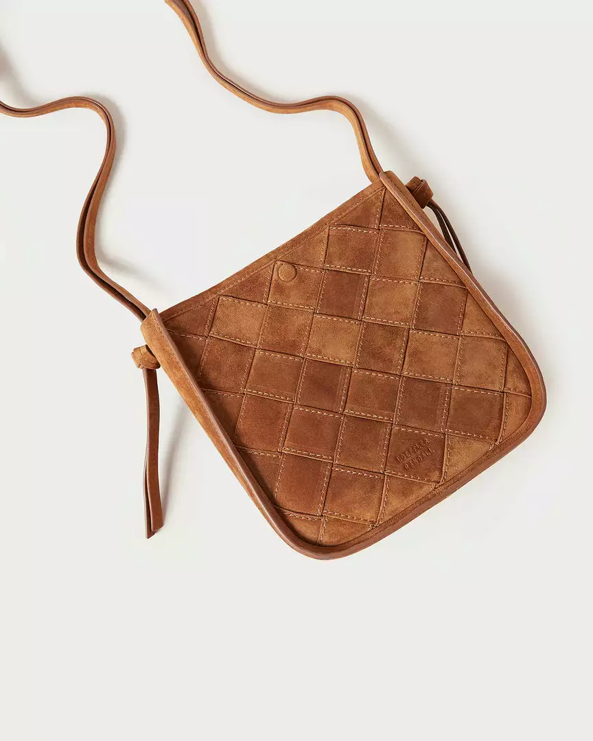 Turned out crossbody tote in cacao brown Italian split suede. Features a crossbody strap, snap closure, full lining, and a large interior slip pocket.