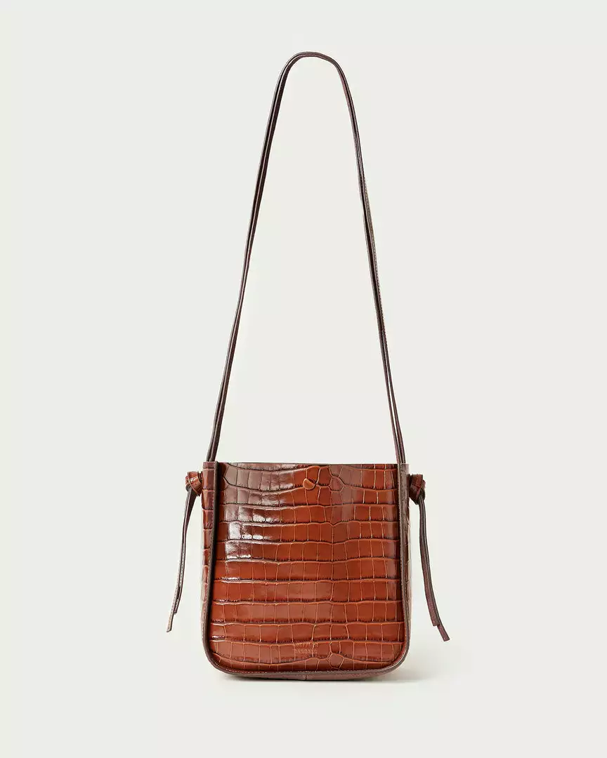 Turned out crossbody tote in mid brown croc-embossed Italian leather. Features a crossbody strap, snap closure, full lining, and a large interior slip pocket.