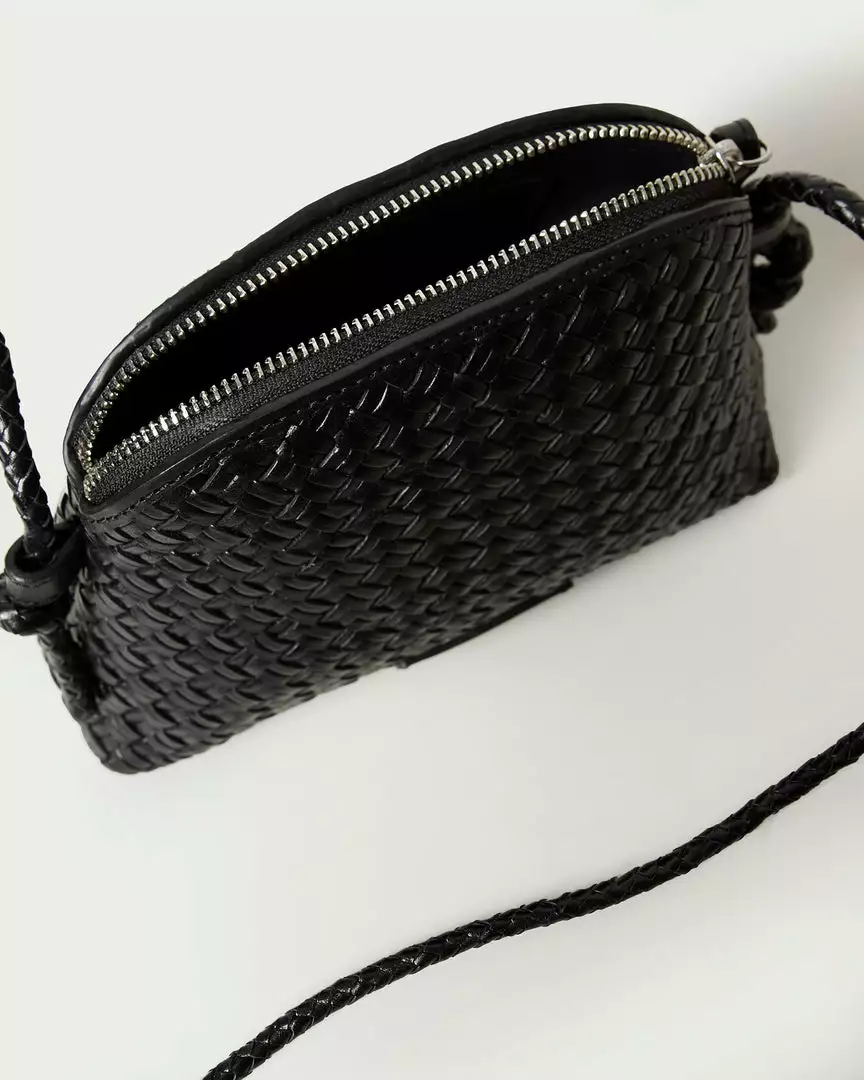 Mini crossbody bag in black woven leather. Features a zipper closure, cotton lining, an interior pocket, and a stamped logo.