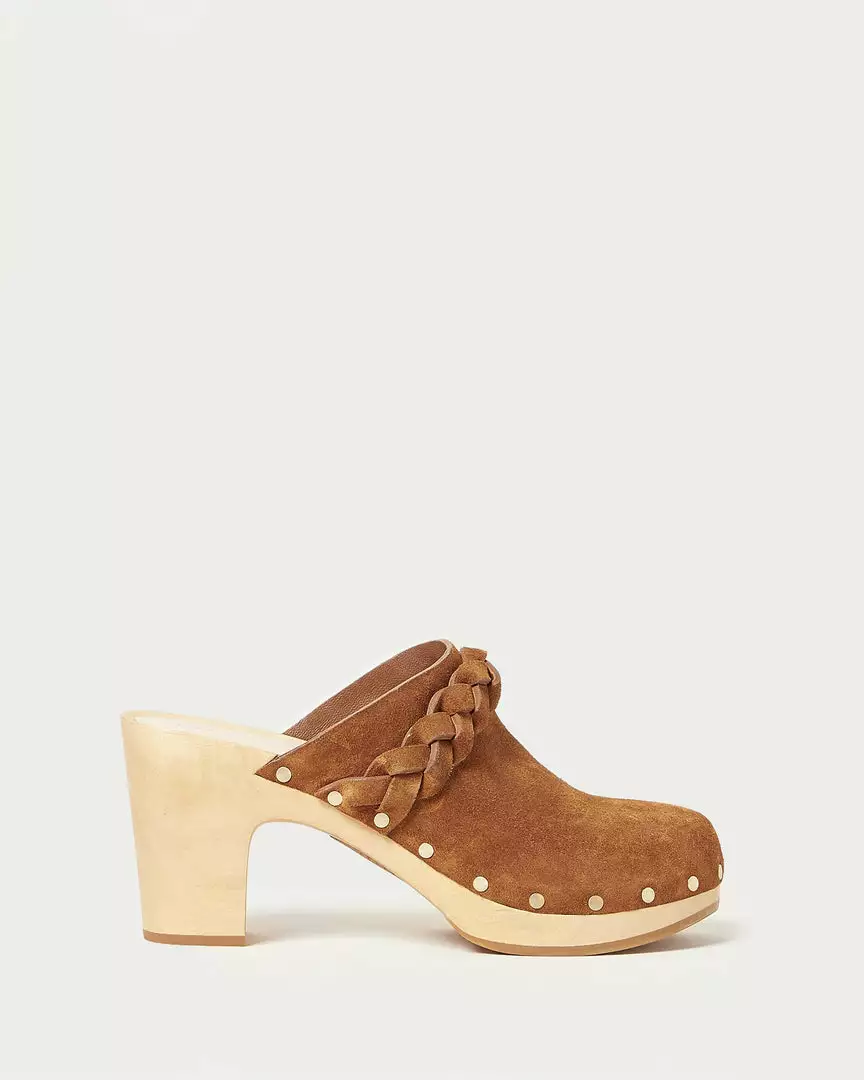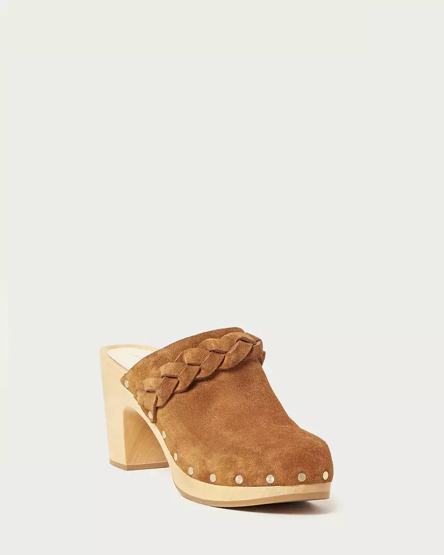 Wooden heeled clog with studded detailing and braided decorative strap in cacao brown Italian split suede. Padded footbed with gold stamped logo. Round toe, slips on. 3.25 inch heel.