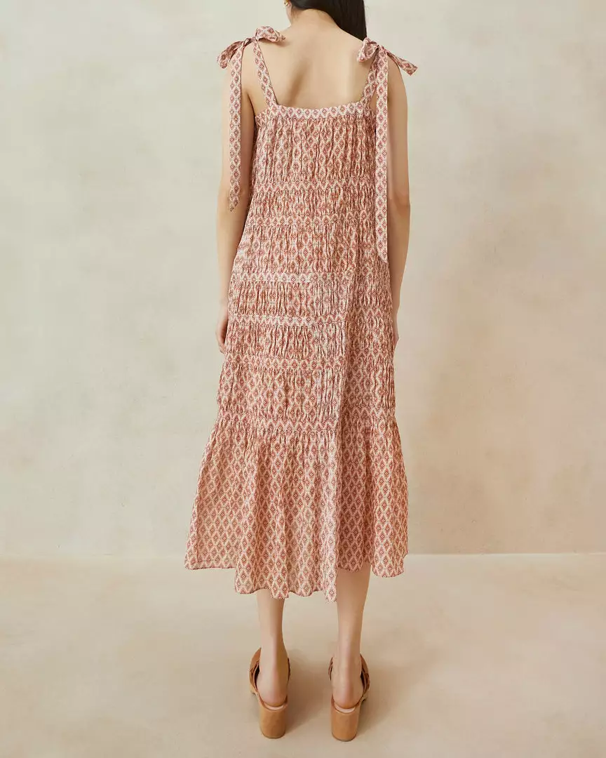 Mid-length pleated tent dress in tan diamond floral cotton voile. Features a square neckline and thin straps with trailing bows.