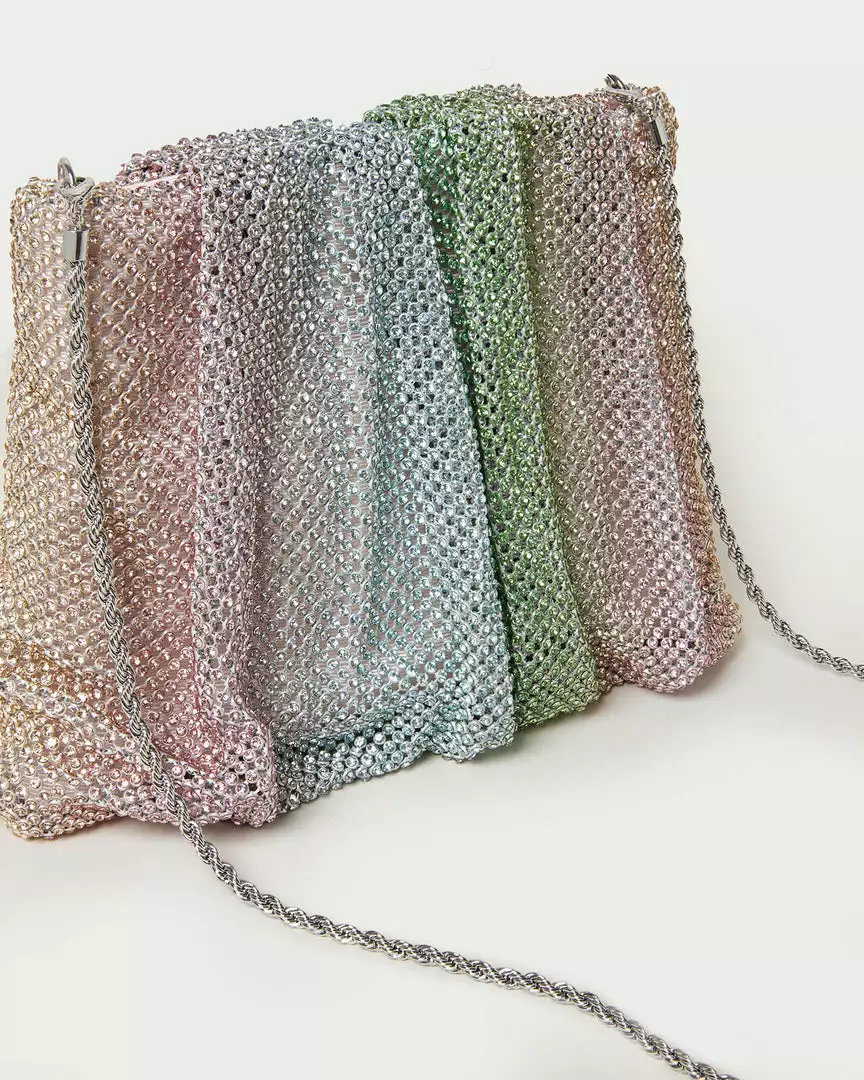 Gathered flat clutch in rainbow diamanté mesh. Features a removable twisted gold metal chain strap, frame closure, full lining, and an interior pocket.