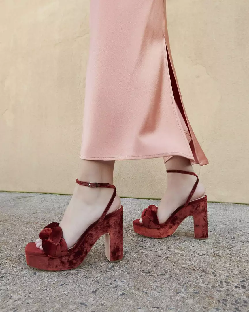 Platform sandal in spice orange-y brown velvet with puffy braided detail. Padded raised footbed with gold stamped logo. Open toe with adjustable buckle ankle strap. 1″ platform, 4.5″ heel.