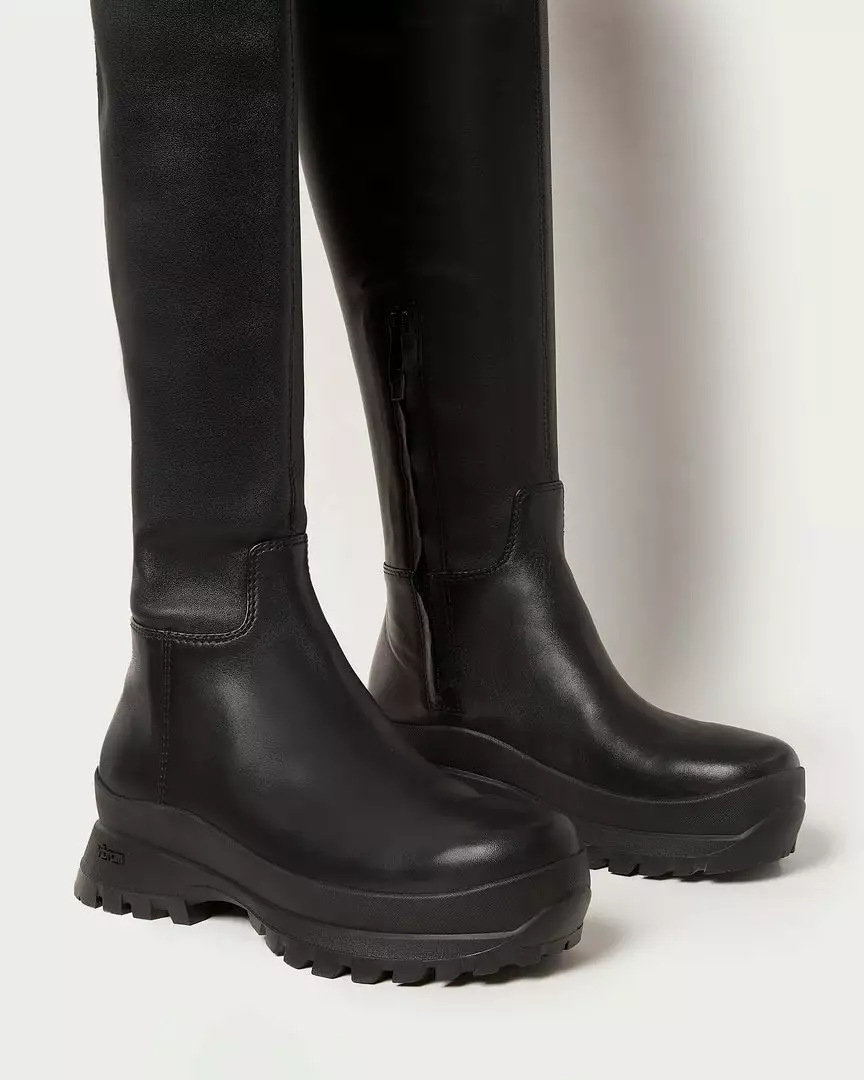 Over-the-knee lug sole boot in black stretch leather. Features a padded footbed with gold stamped logo, round toe, and a Vibram® outsole, which is engineered for quality and comfort with traction optimized for unstable terrain. Pulls on. 3 inch heel.