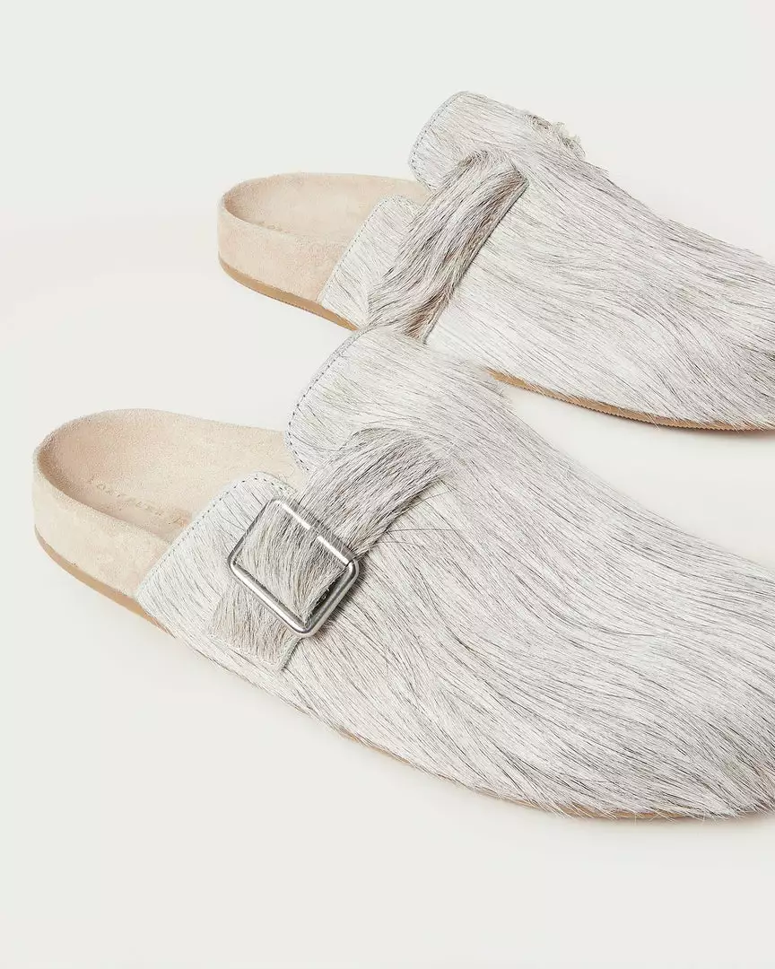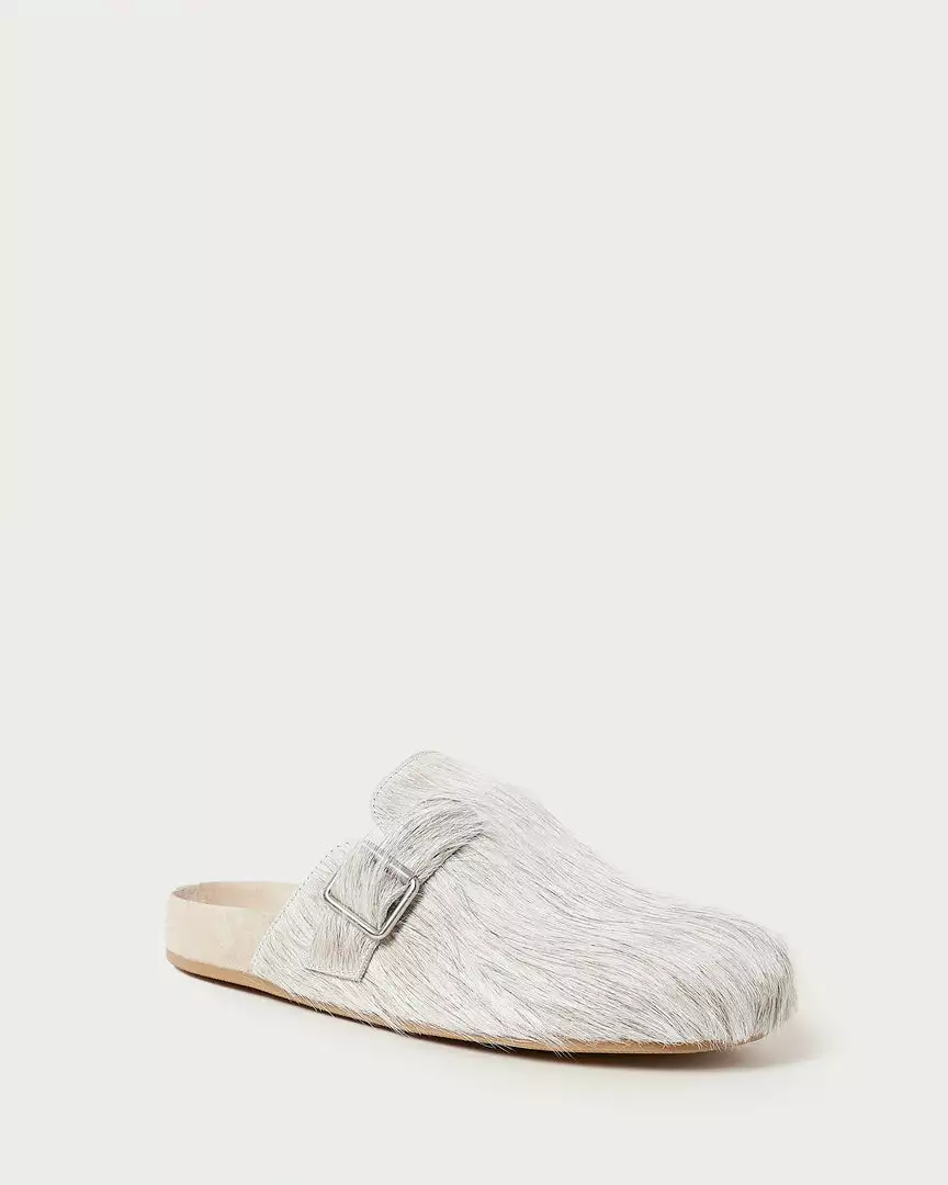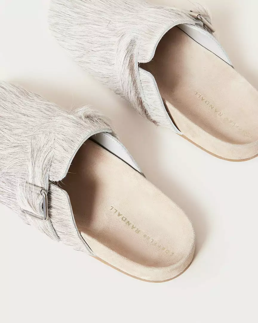 Flat clog with decorative silver buckle in cream-colored Italian haircalf. Features a suede footbed and gold stamped logo. Round toe, slips on.