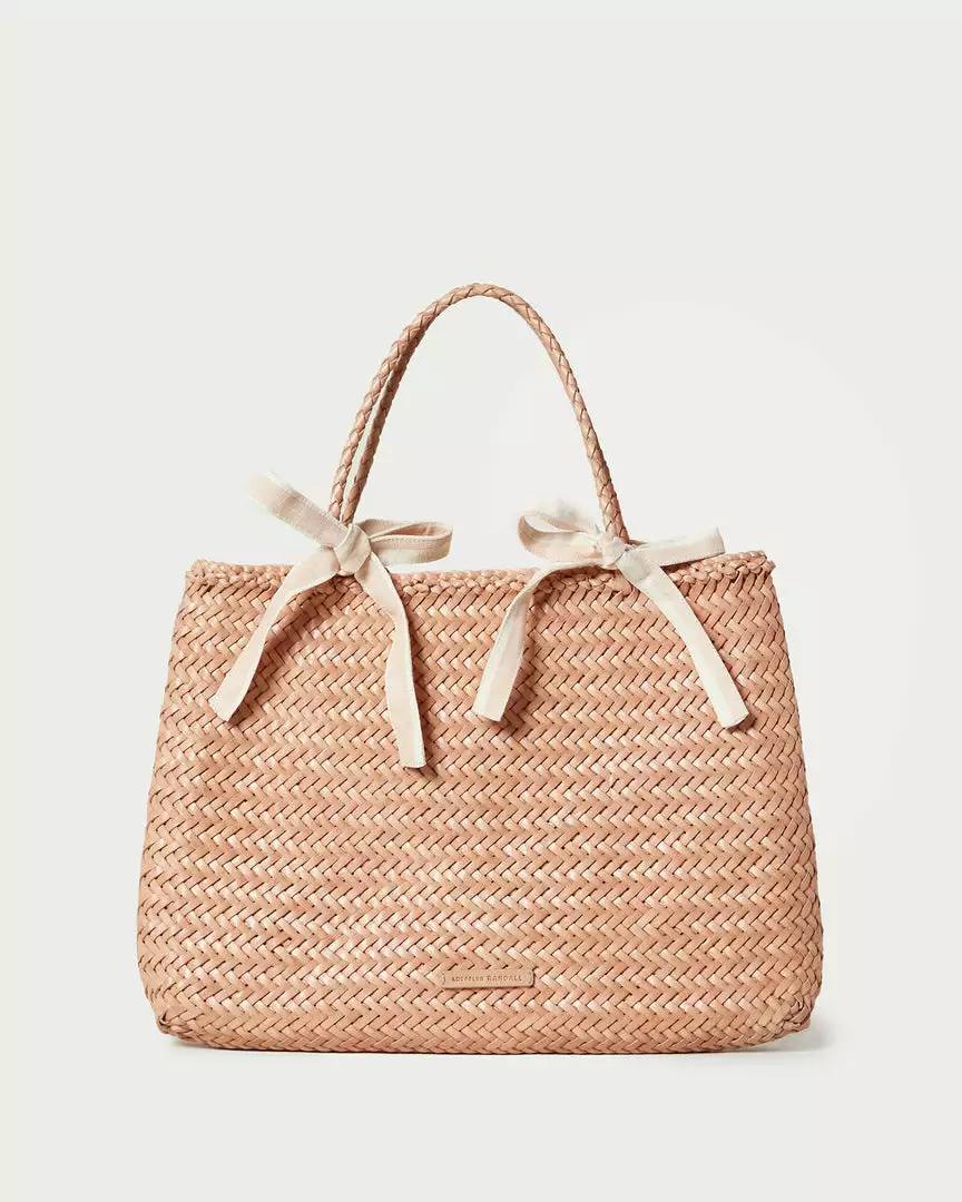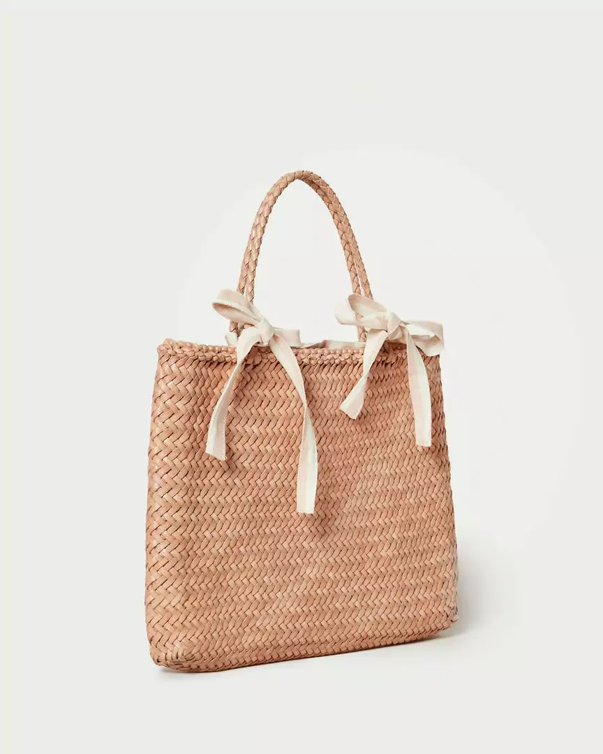 Tote bag in natural beige woven leather. Features blush pink and cream-colored gingham lining and bow detailing, as well as leather top handles.