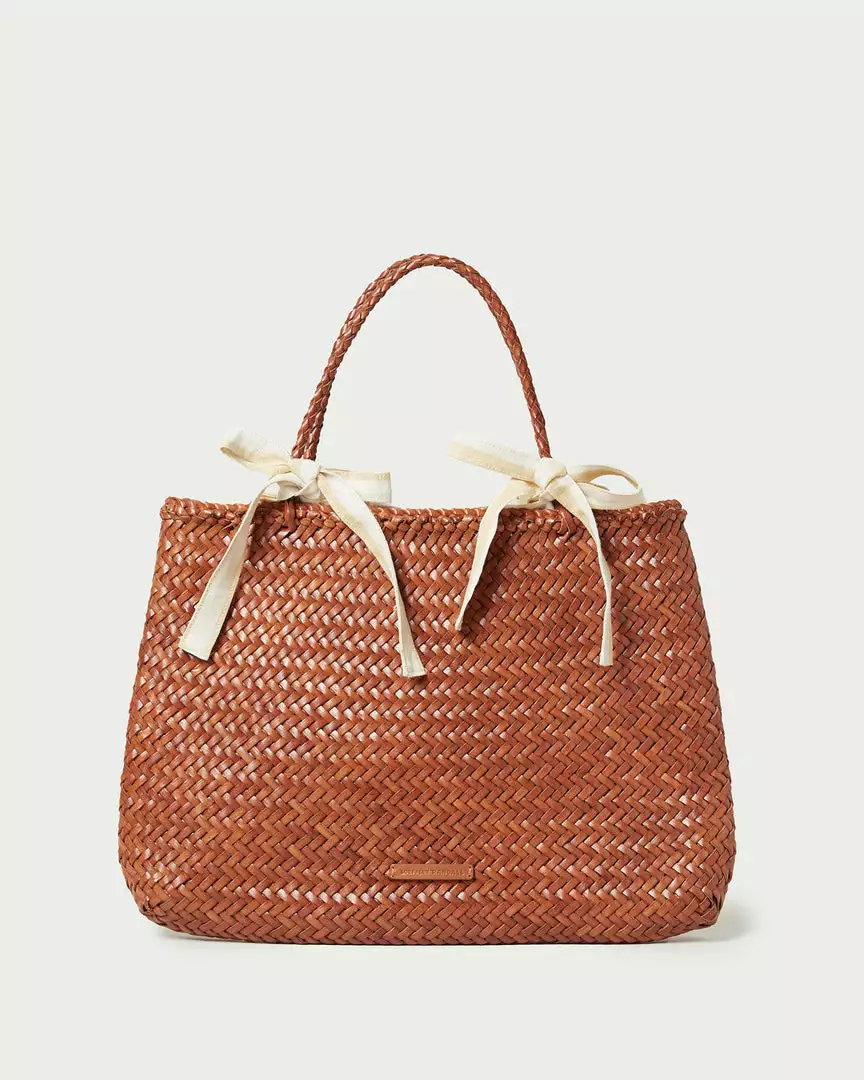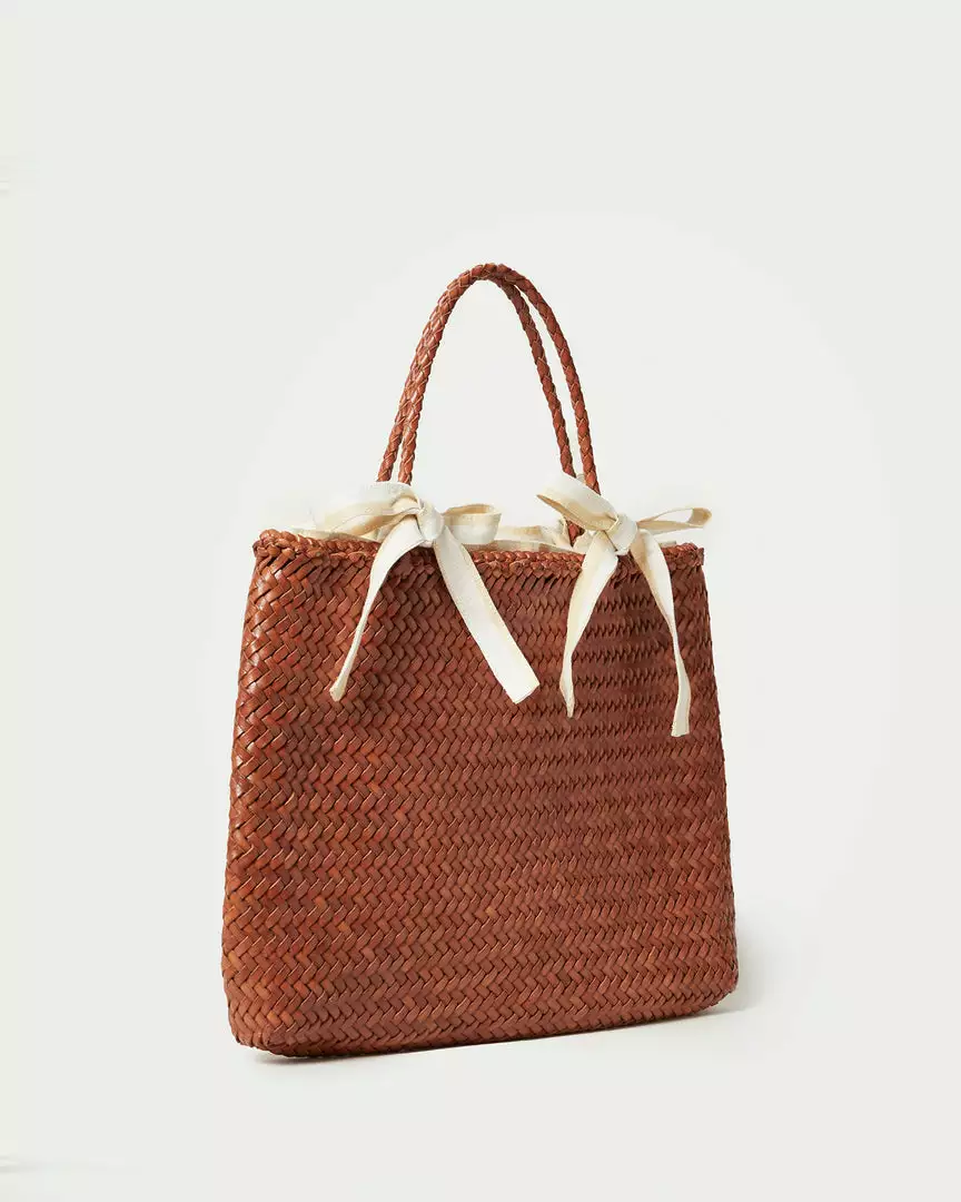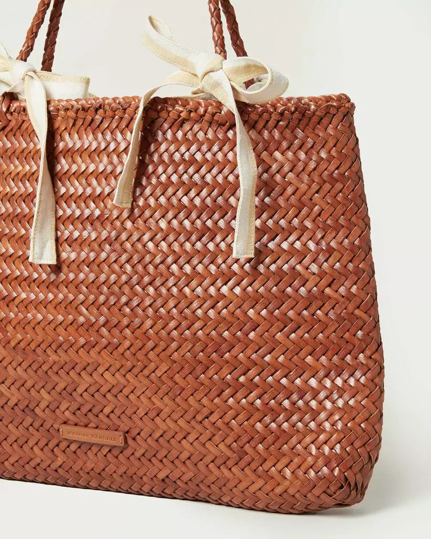 Tote bag in timber brown woven leather. Features brown and cream-colored gingham lining and bow detailing, as well as leather top handles.