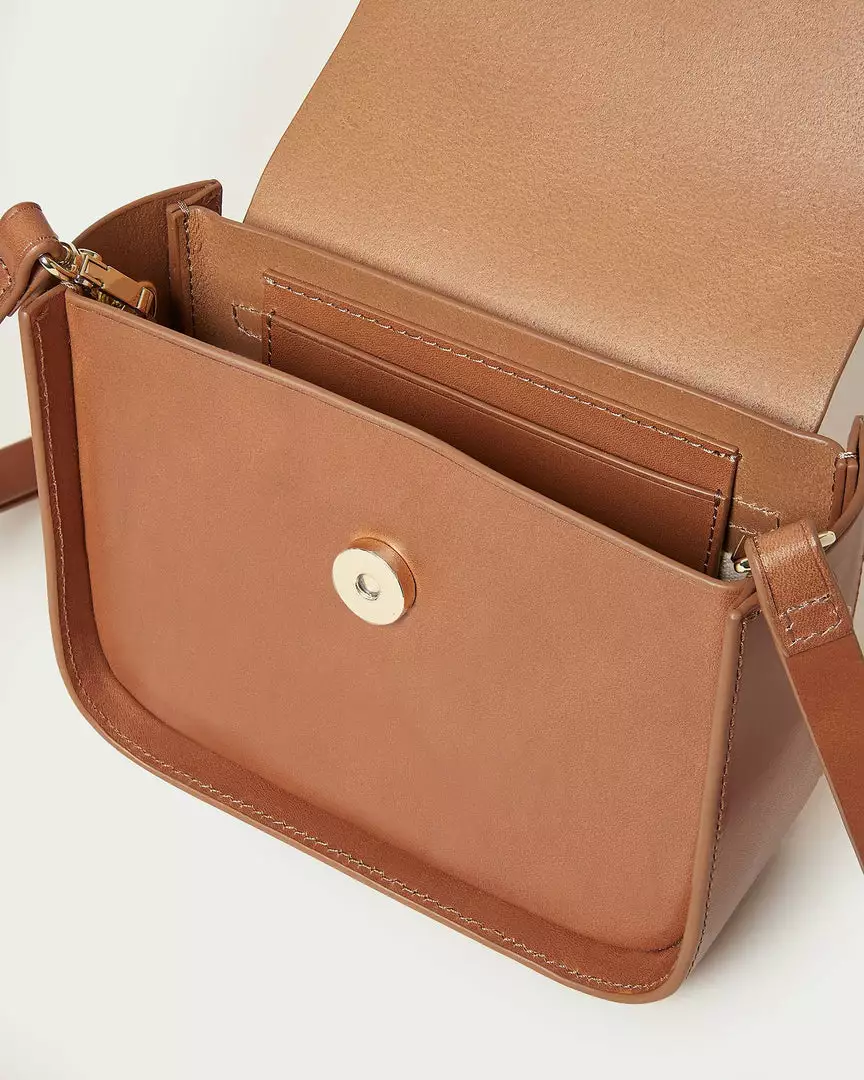 Crossbody bag in safari beige Italian vachetta leather. Features a vachetta leather crossbody strap, a resin and metal magnetic closure, and an inside pocket.