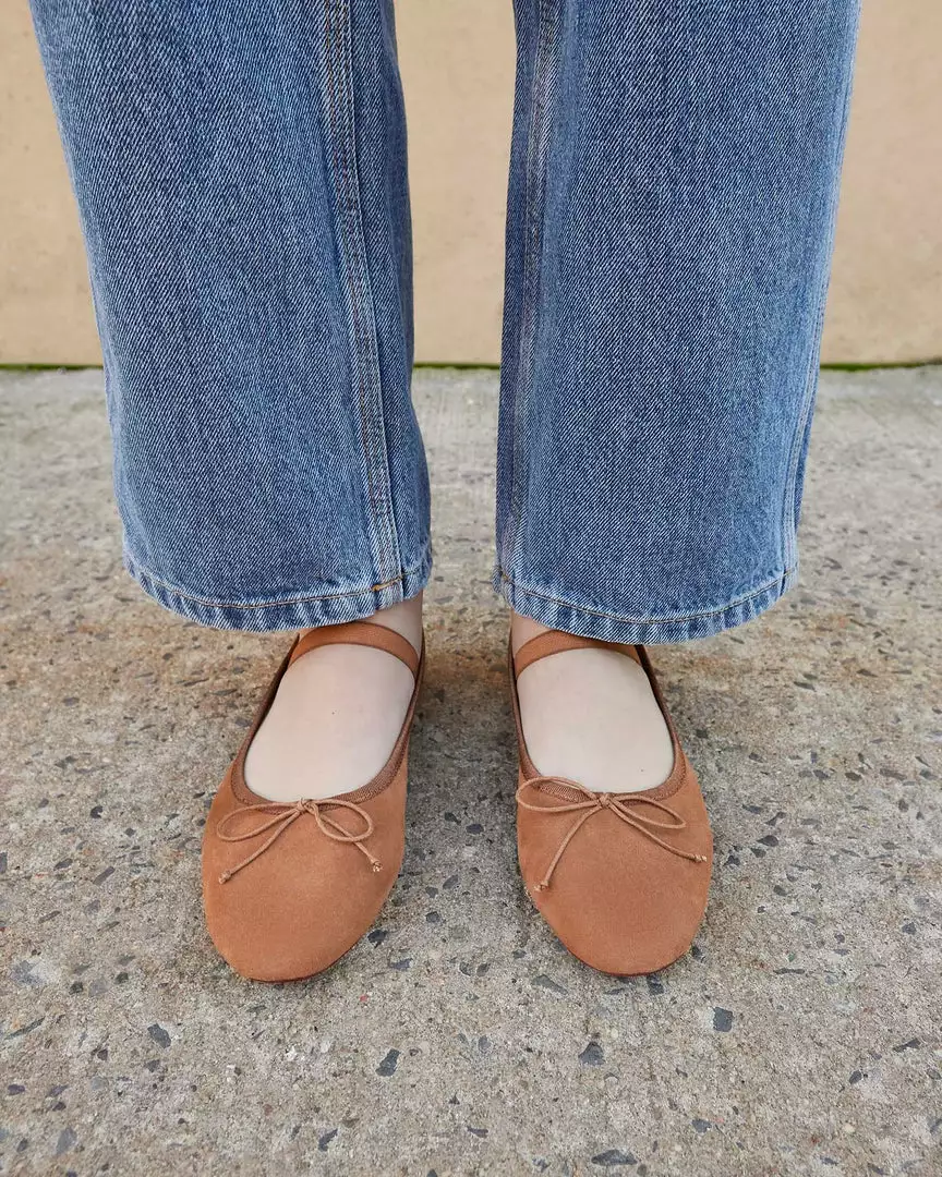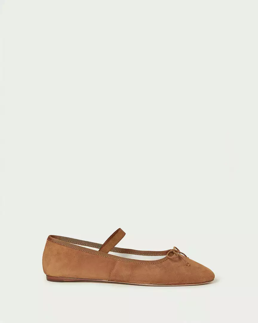 Soft ballet flat in cacao brown suede with elastic bridge strap and bow detail at toe. Padded footbed with stamped logo and leather sole.