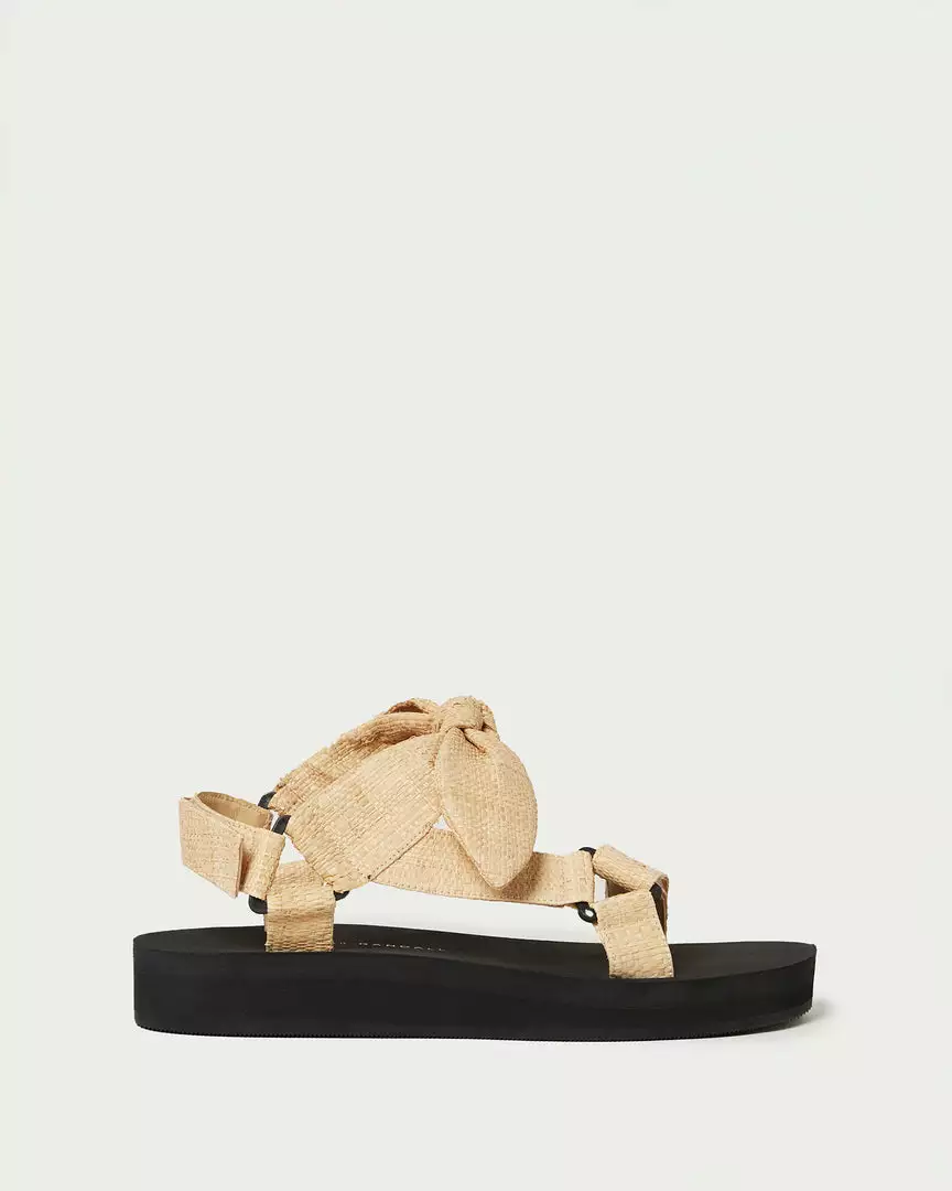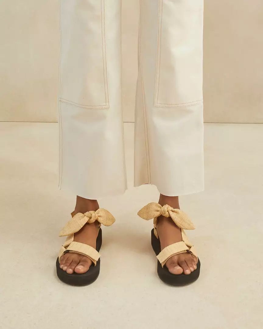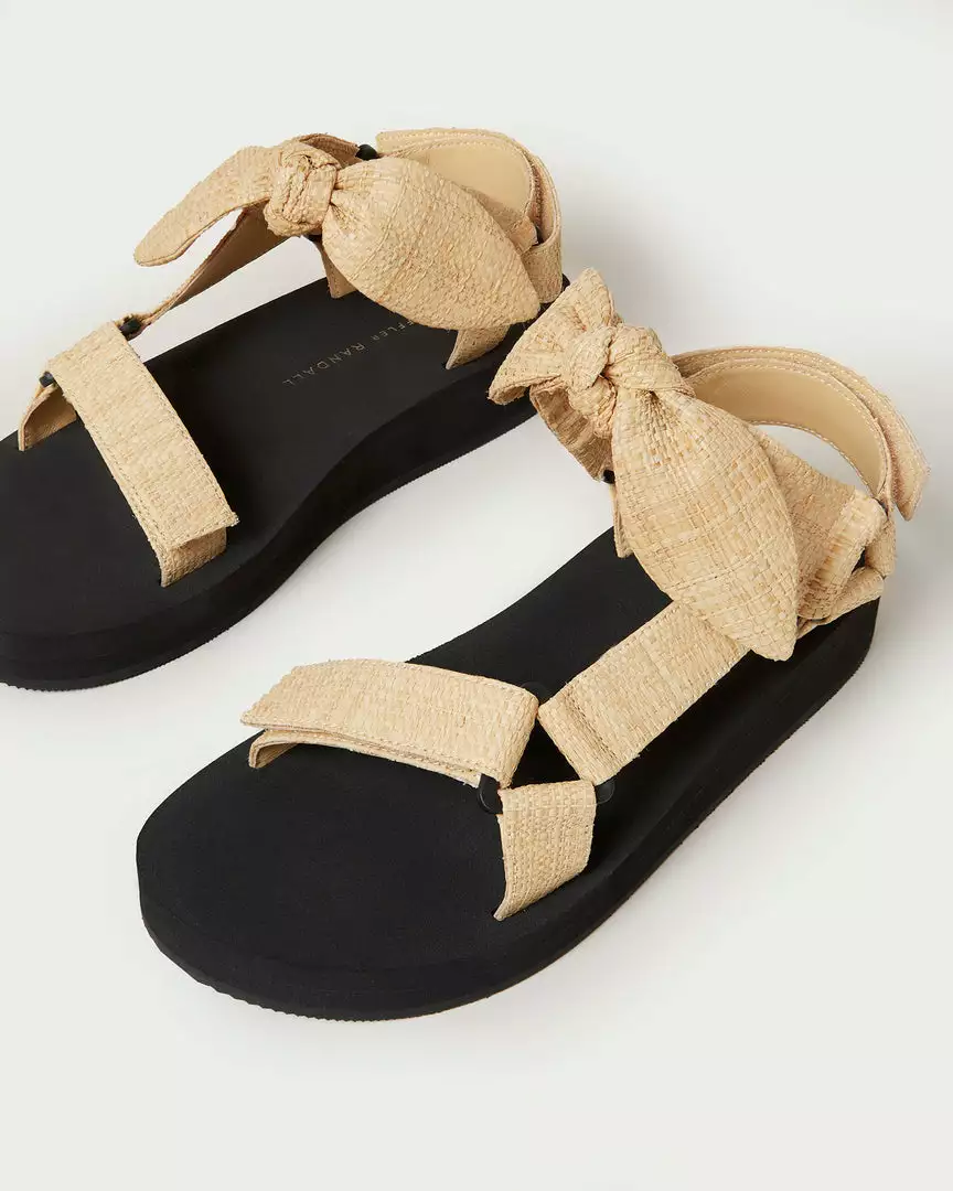 Sport sandal with bow detailing in natural raffia. Features a cushioned foam footbed with gold stamped logo, an open toe, and a hidden velcro closure.