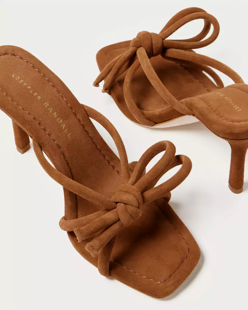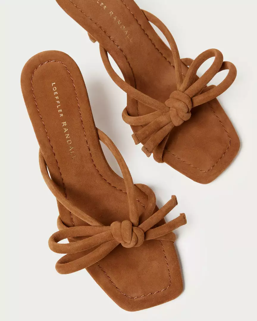 Heeled sandal with knotted bow detail in cacao brown suede. Features a padded footbed with gold stamped logo and an open, squared toe. 3.5 inch heel.
