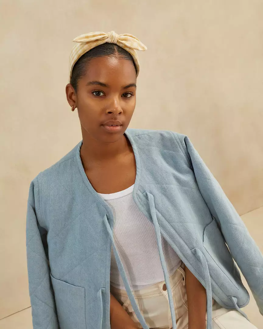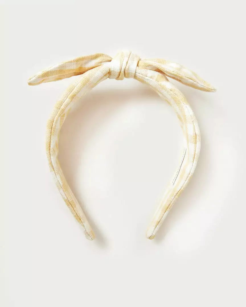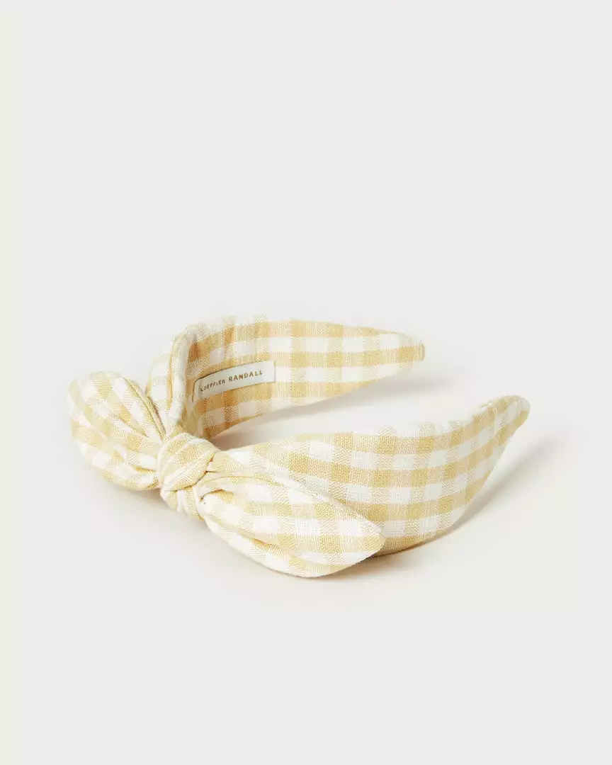 Wide knotted bow headband in pale yellow and cream gingham canvas fabric.