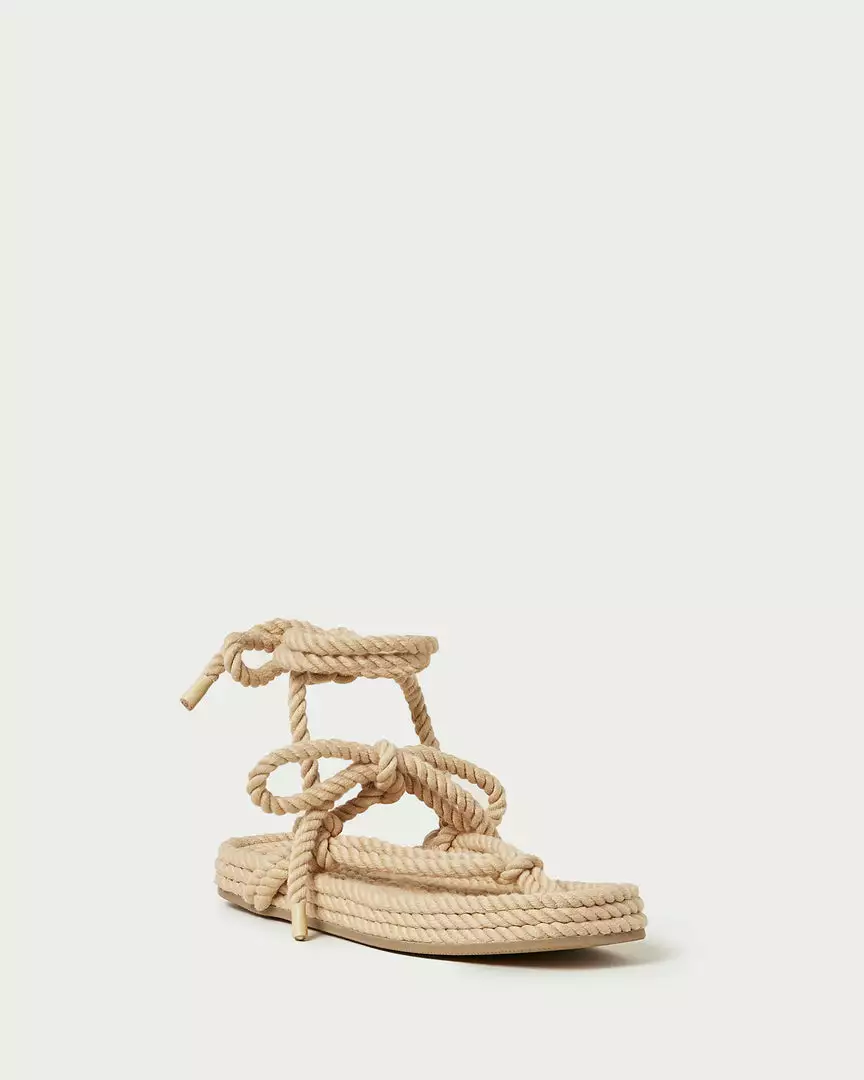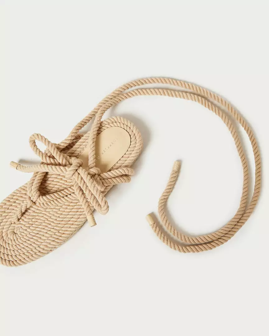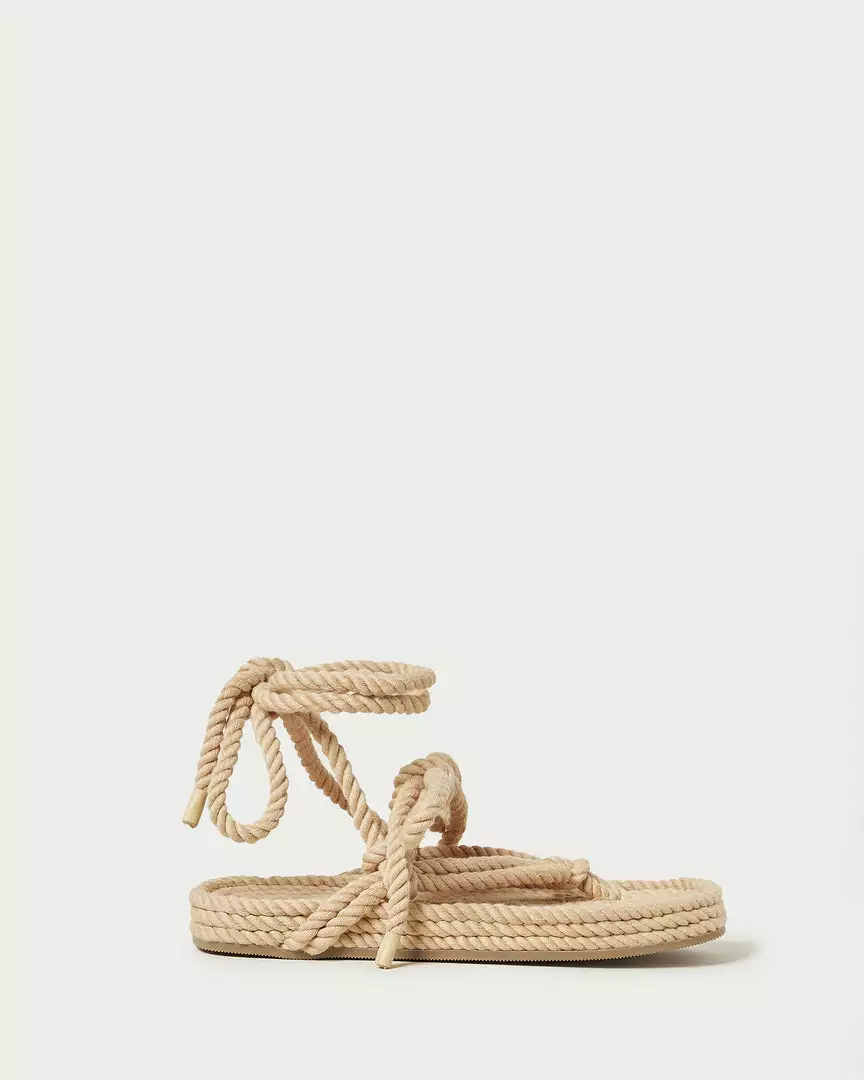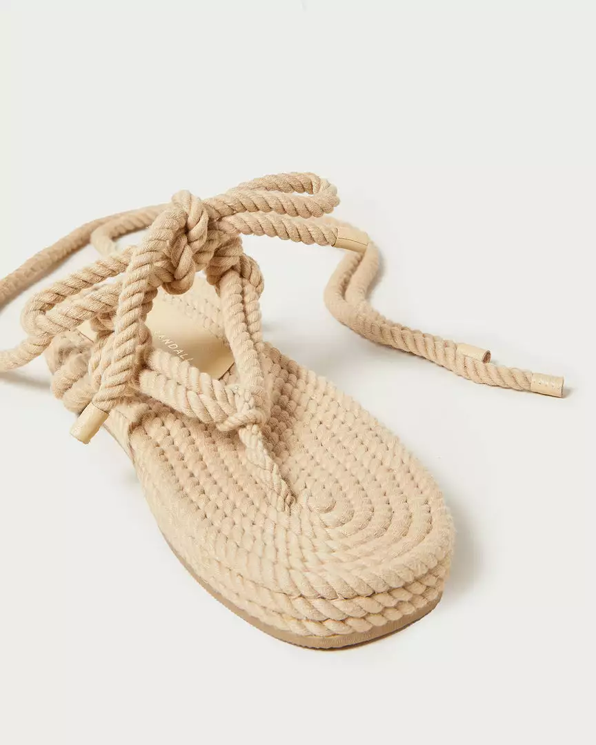 Strappy flat thong sandal in natural rope. Features an open toe and ankle wrap closure.