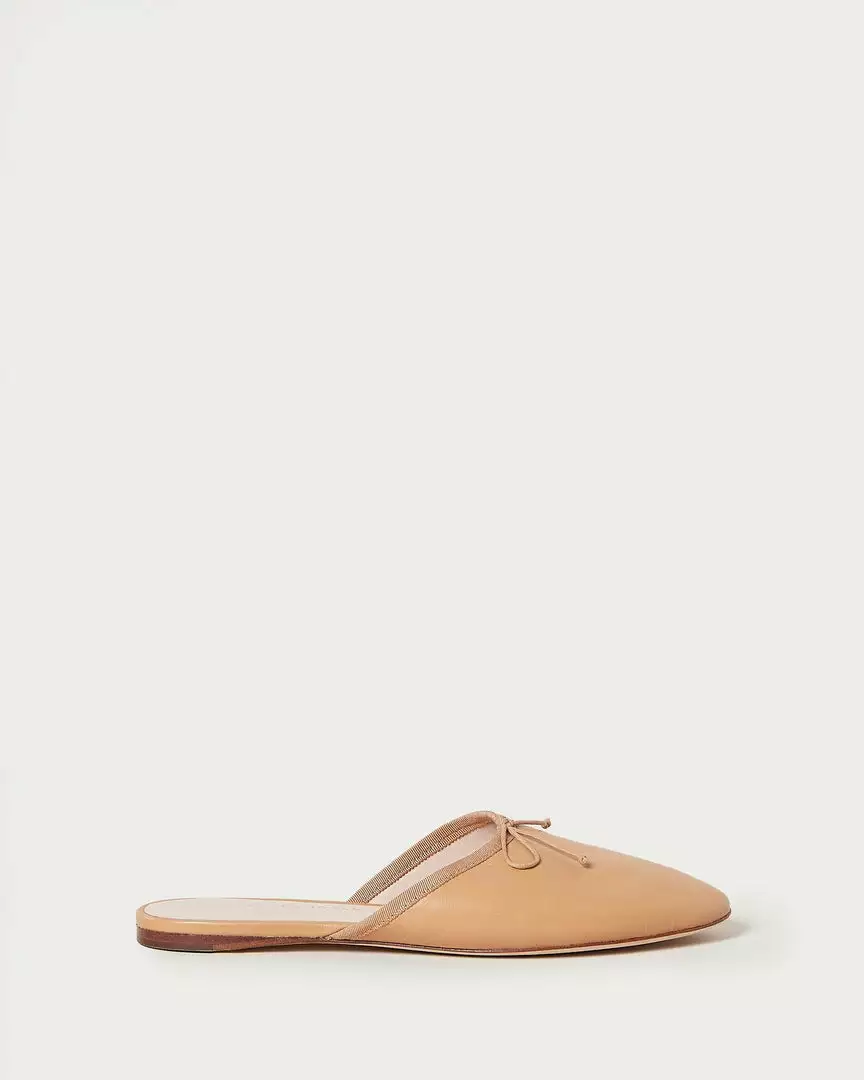 Slip-on flat mule in caramel tan leather with bow detail in center.