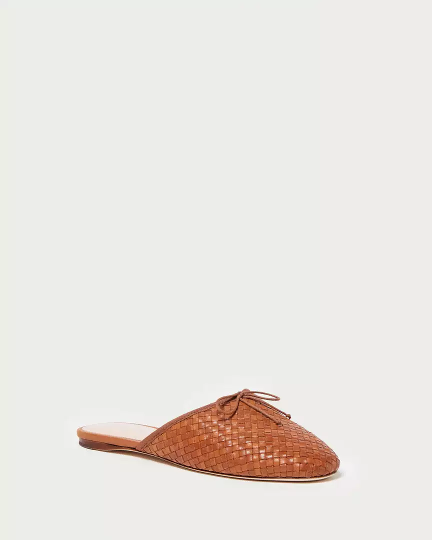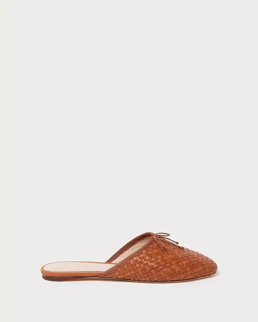 Slip-on mule ballet flat in timber brown woven leather with classic bow detail. Features a padded footbed with gold stamped logo and an almond toe.