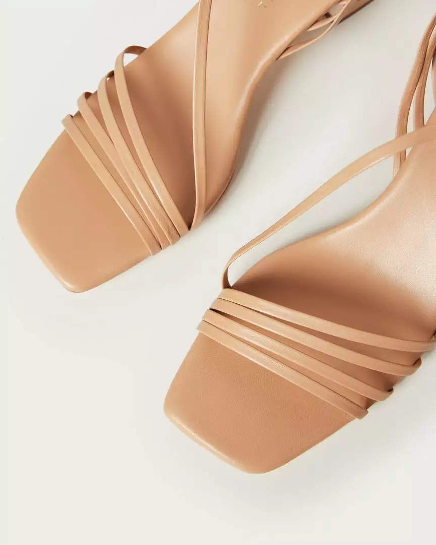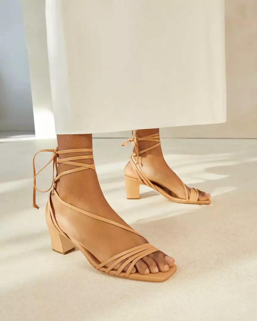 Strappy mid-heeled sandal in dune beige glove calf leather. Features a gold stamped logo, an open, square, toe, and adjustable ankle wrap tie. 2.5 inch heel.