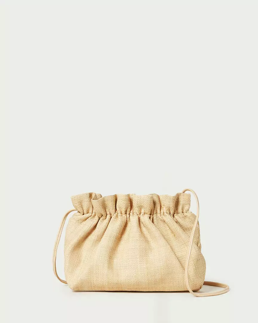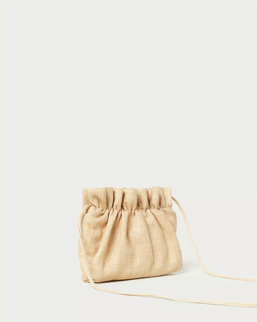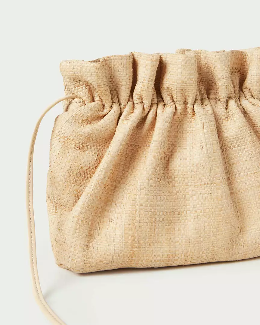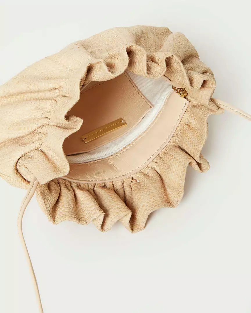 Mini cinched crossbody bag in natural raffia. Features a crossbody strap, frame closure, and cotton lining.