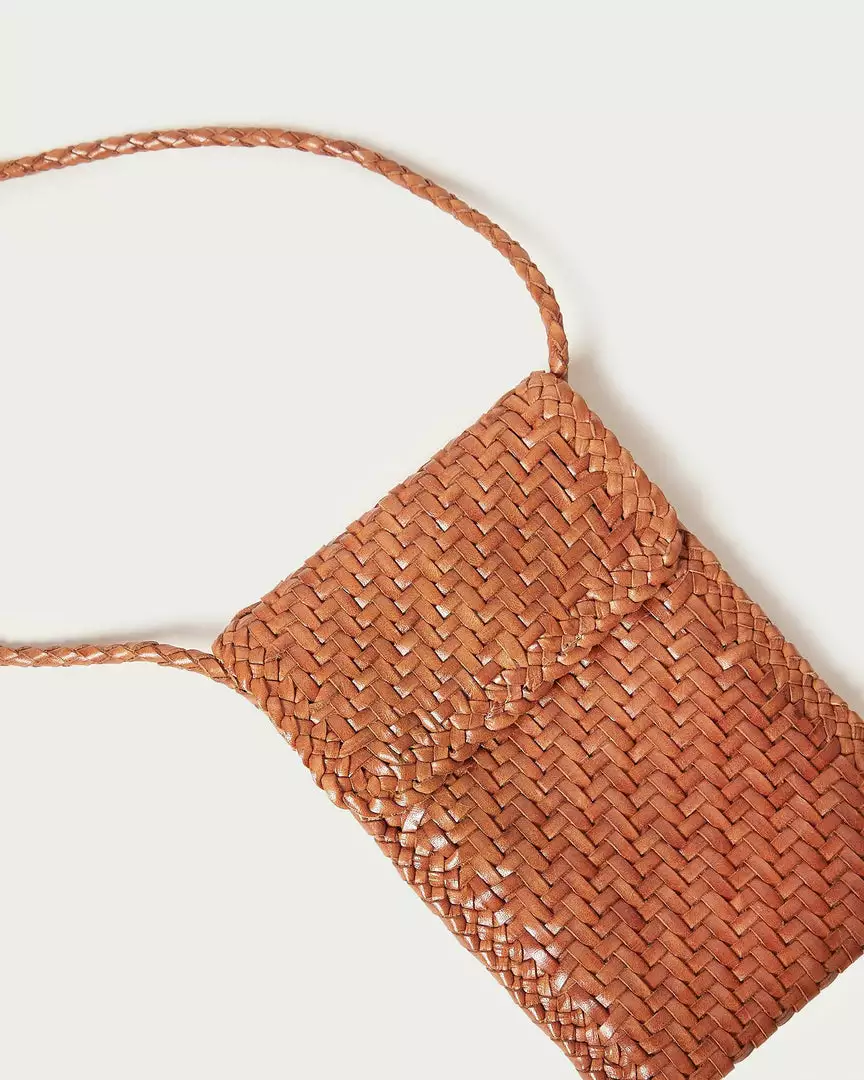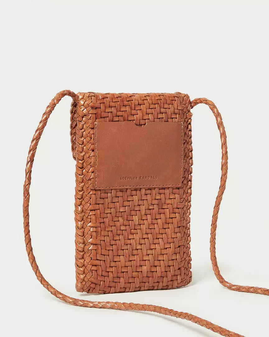 Crossbody phone bag in timber brown woven leather. Features a magnetic flap closure, woven leather crossbody strap, and exterior slip pocket with an embossed logo.