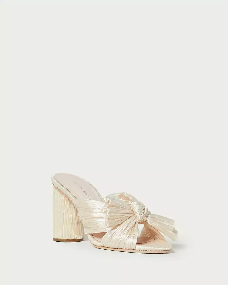 Pleated heeled sandal in cream fabric topped with our signature knotted bow. Features a padded footbed with gold stamped logo and an open toe. 3.5 inch heel.