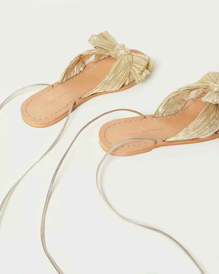 Pleated bow plank sandal in metallic gold lamé. Features a tonal stamped logo, contrast stitching, an open, square toe, and an ankle wrap closure.